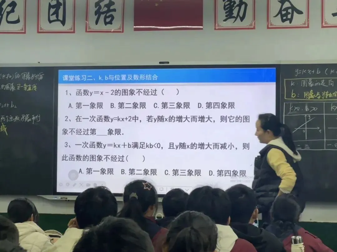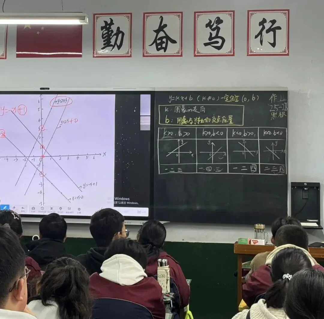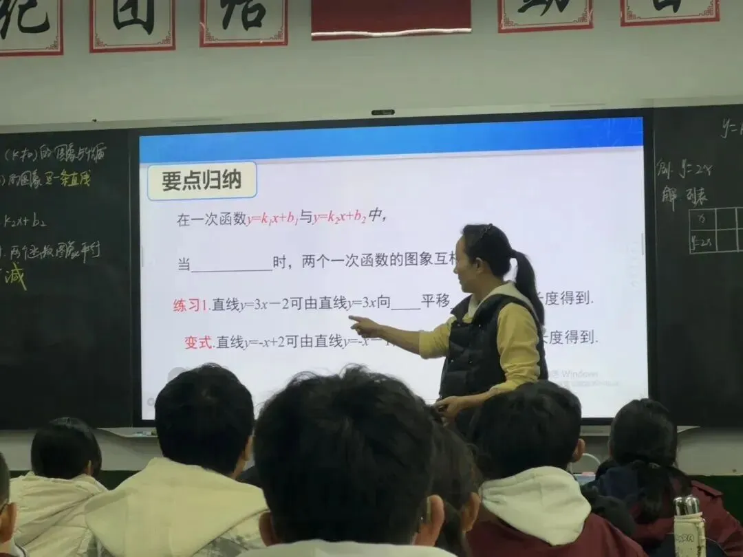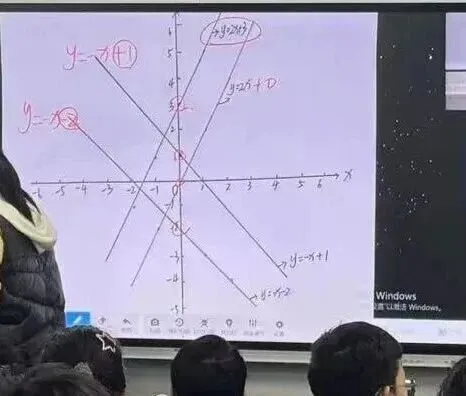 通过同学们自己操作并观察发现这些点也在同一条直线上。 此时老师提问,是不是巧合,我们再试试y=−x+1,同学们也发现这些点也在同一条直线上,因此我们可以得出本节课一个重要的知识点:一次函数的图象是一条直线。而由于两点确定一条直线,所以在后面画一次函数图象中,可以用两点法绘图。