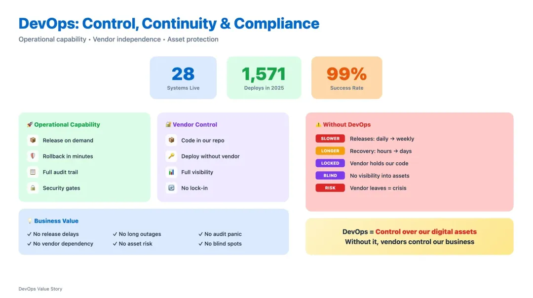 "帮我制作一个DevOps价值呈现的PPT,包含当前运维能力数据(28个系统、1571次部署、99%成功率)和2026年规划(新增17个系统、AI代码审计、安全左移等)。风格要专业、商务,突出数据对比和价值主张。"