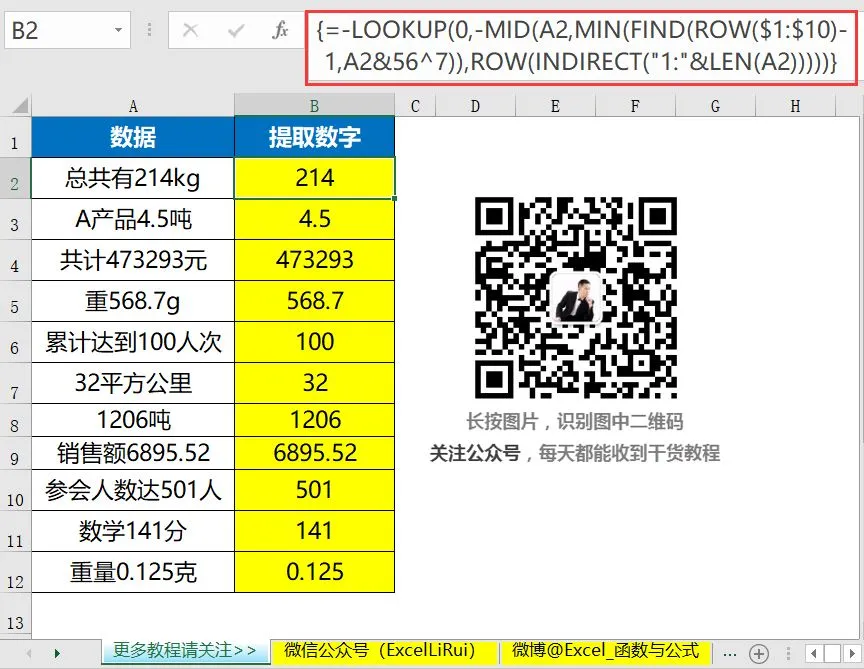 使用FIND和ROW函数定位数字起始位置,然后再利用MID函数截取数字,最后用LOOKUP函数完成提取。