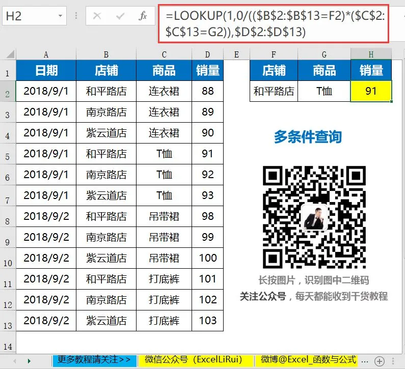 下图中左侧数据源包含不同店铺的商品销量,要求根据店铺和商品多条件查询对应的销量。
