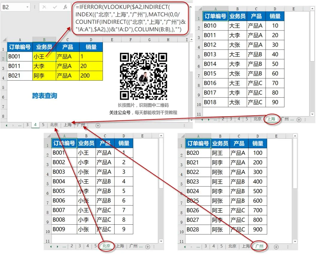 下图中数据源分散在北京、上海、广州3张工作表中,要求根据订单编号在多工作表中查询对应的业务员、产品、销量。