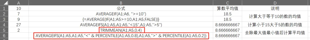这个函数的实际应用场景还比较多。在比赛中剔除最高分与最低分再计算算数平均值,就可以使用这个函数轻松实现。