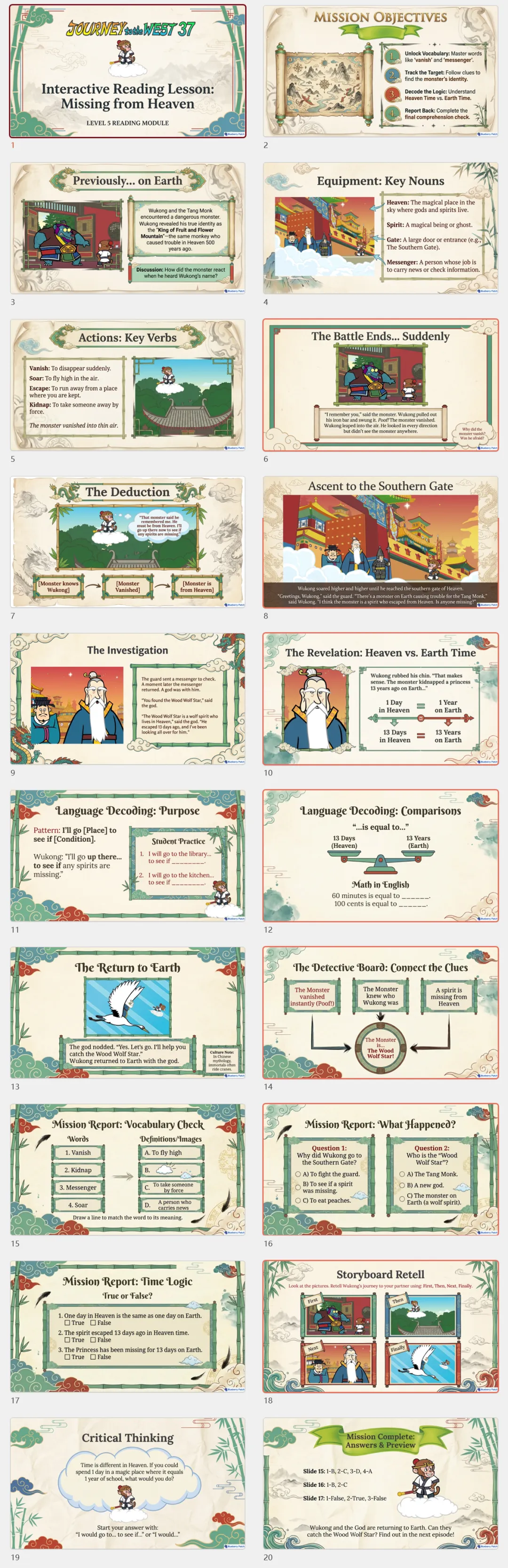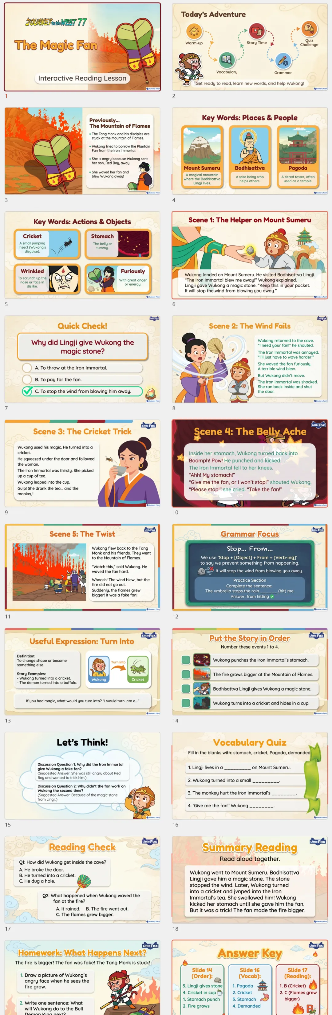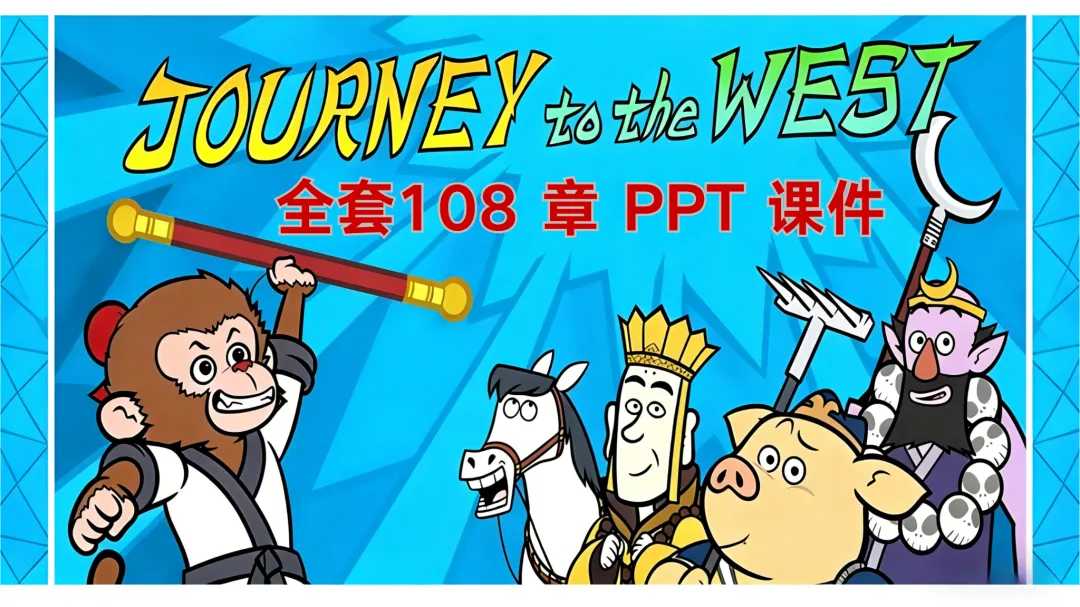 今天分享一套火爆的《西游记 / Journey to the West》全套108章的PPT课件。用地道的英语,讲述中国孩子最熟悉的故事。专为英语学习设计,把经典名著变成趣味课堂这套《西游记》PPT教学资源。精准贴合英语学习需求,将 原文108 章经典情节拆解成循序渐进的课堂模块,从词汇积累到语法练习,从阅读理解到思维拓展每一章 PPT 都遵循 “热身 - 学习 - 练习 - 测试” 的完整课堂逻辑图文并茂,符合孩子认知特点,让孩子直观理解剧情,降低阅读难度。关键词汇、语法点用特殊格式标注,重点突出,方便孩子聚焦学习。