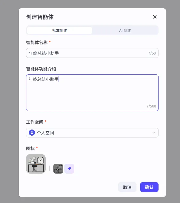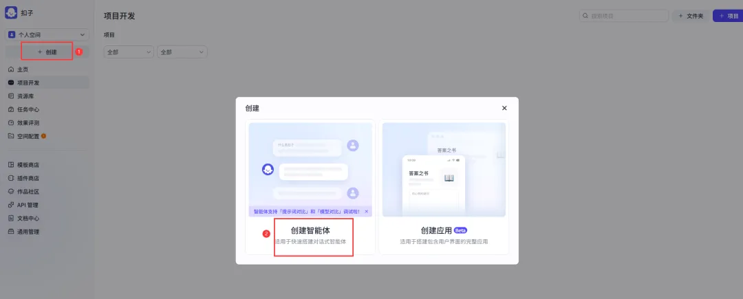 我们可以在扣子(https://www.coze.cn/)上创建智能体,进入扣子后台,点击【创建】,选择【创建智能体】