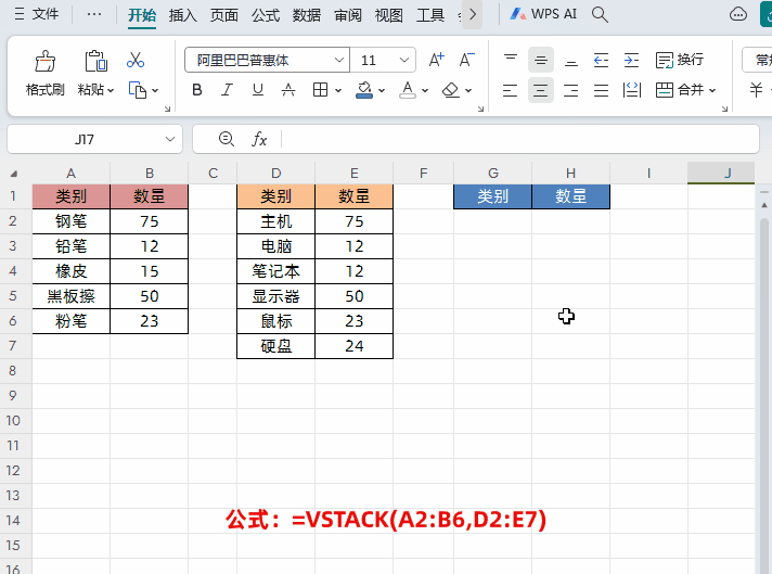 功能:将多个数组或表格区域按垂直方向堆叠,合并为一个新数组。语法:=VSTACK(数组1, 数组2, 数组3, …)二、基础应用:快速合并多个表格