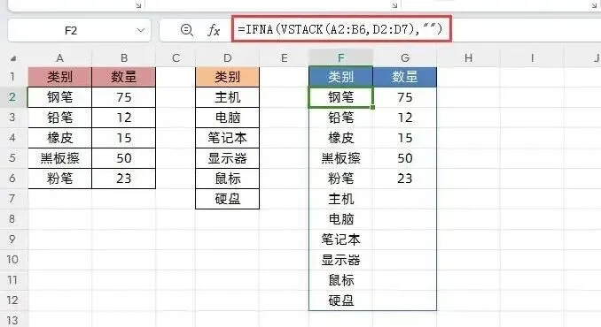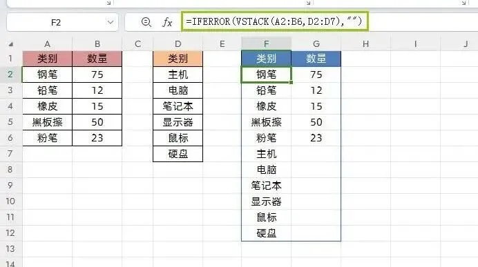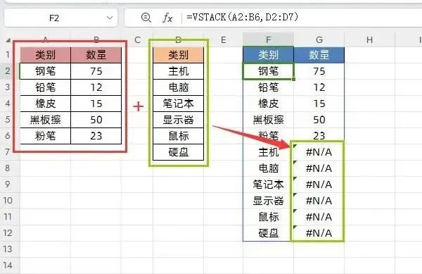 场景:将同一工作簿中结构相同的多个表格(如表1: A2:B6, 表2: D2:E7)合并成一张总表。在目标单元格输入公式:=VSTACK(A2:B6, D2:E7)结构一致是前提:所有待合并表格的列数必须相同,且对应列的表头字段顺序最好一致,否则数据会错位。错误值处理:如果表格列数不同,合并后缺失数据的部分会以#N/A错误值填充。为保证报表美观,建议搭配IFNA或IFERROR函数进行优化。=IFNA(VSTACK(A2:B6, D2:E7), "")// 将#N/A显示为空白=IFERROR(VSTACK(A2:B6, D2:E7), "")// 处理所有错误类型提示:跨工作表的合并在操作上完全一致,只需在公式中正确引用不同工作表的数据区域即可。