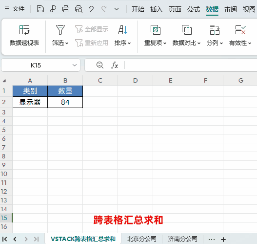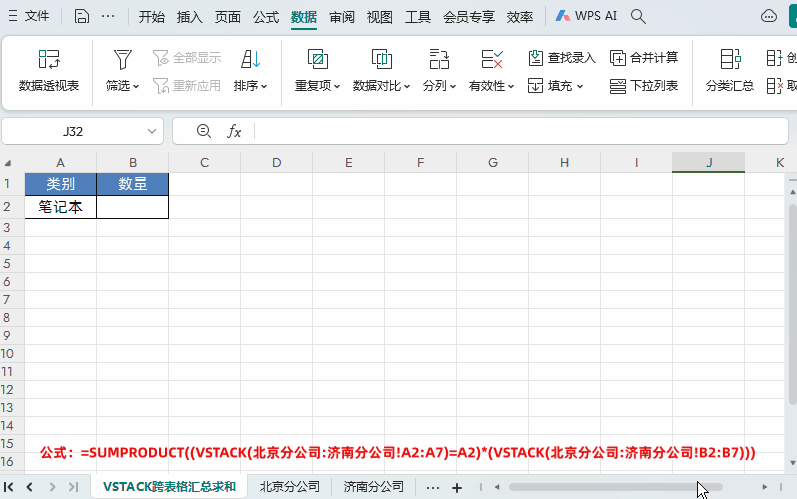 场景:需要根据产品类别,分别汇总“北京分公司”和“济南分公司”两个工作表中的销售数量。解决方案:结合VSTACK与SUMPRODUCT函数,实现强大的一对多条件求和。=SUMPRODUCT((VSTACK(北京分公司:济南分公司!A2:A7)=A2) * (VSTACK(北京分公司:济南分公司!B2:B7))VSTACK(北京分公司:济南分公司!A2:A7)=A2:此部分首先将两个分公司表中所有产品类别合并,并与当前表格的指定类别(A2单元格)进行比较,得到一个由 TRUE/FALSE构成的数组。VSTACK(北京分公司:济南分公司!B2:B7):将两个分公司表中所有对应的数量合并成一个数组。SUMPRODUCT(...):将逻辑值数组(TRUE视为1,FALSE视为0)与数量数组对应相乘并求和,从而得出指定产品的总量。四、核心技巧:跨表引用的两种写法