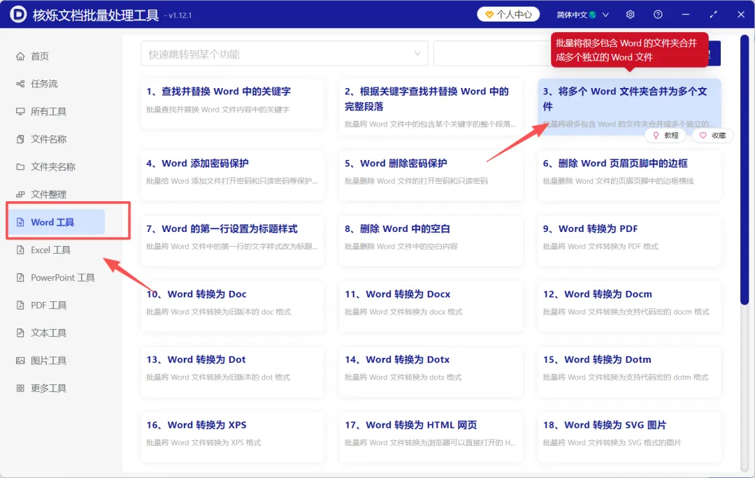 1、打开【核烁文档批量处理工具】,在左侧选择【Word工具】,再到右侧选择【将多个 Word 文件夹合并为多个文件】。