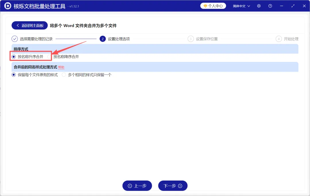 3、排序方式选择【按名称升序合并】,并按需选择【保留每个文件原有的样式】。