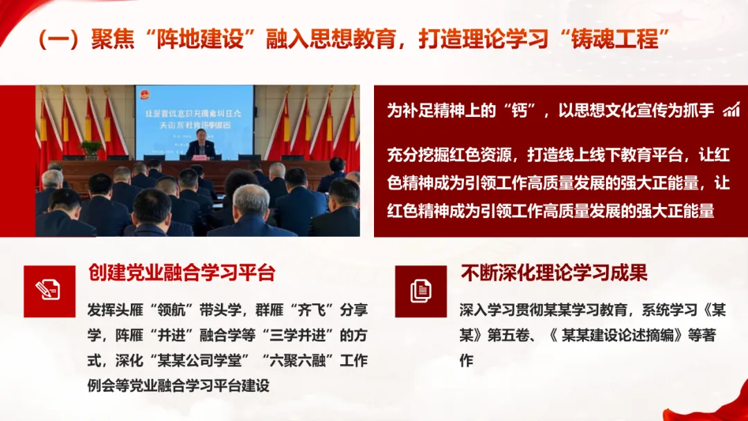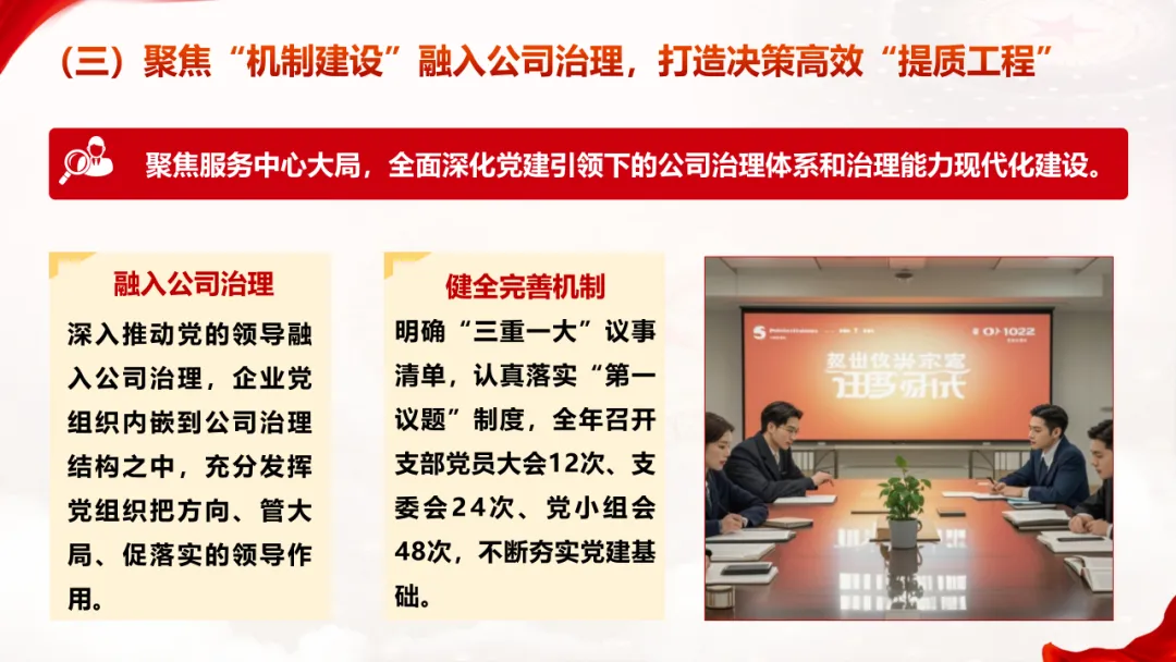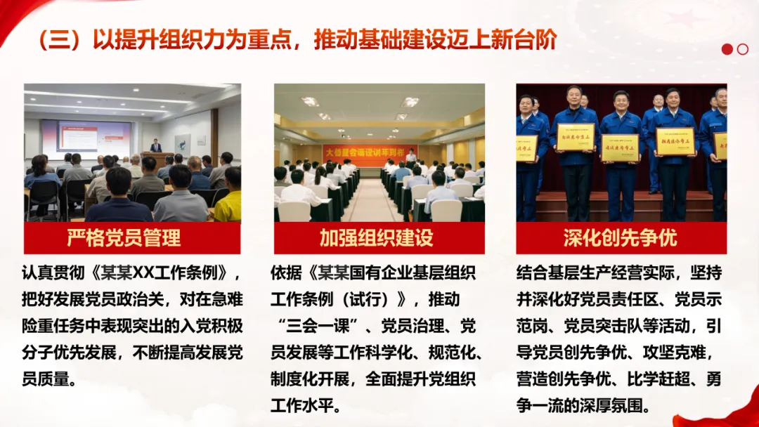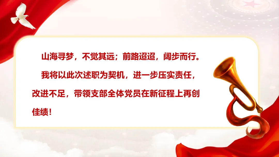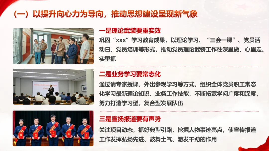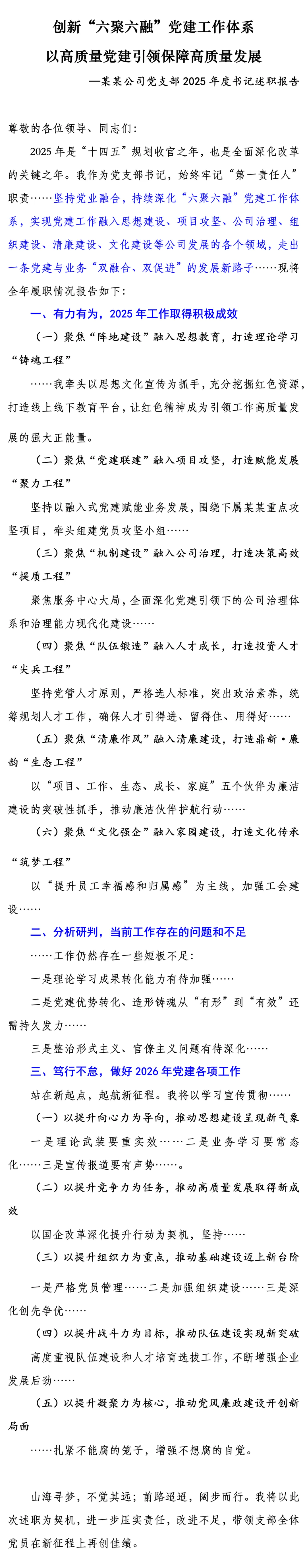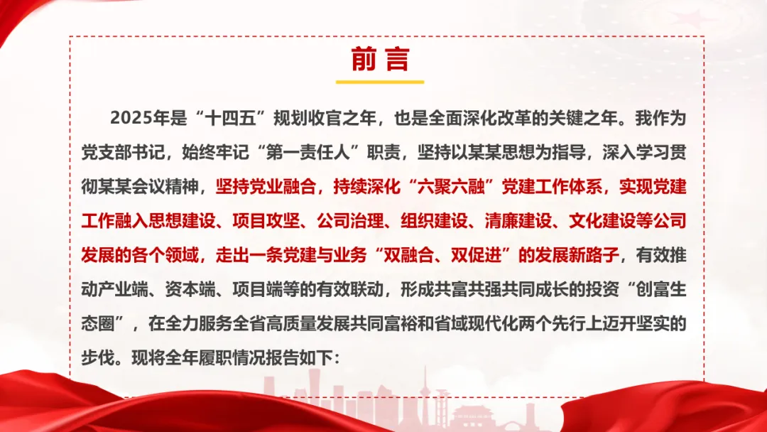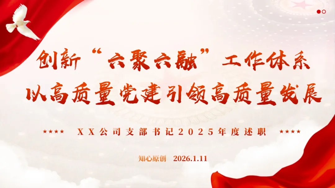 最新PPT《创新“六聚六融”党建工作体系 以高质量党建引领保障高质量发展——某某公司党支部2025年度书记述职报告》课件,助力年终述职。PPT页面精致,结构明晰完整,系统展示国企党支部书记年度述职的系统框架与具体实践。