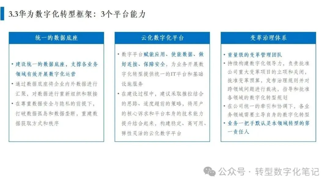 数字化平台需要三大支撑能力:统一数据底座打破数据孤岛、云化数字平台提供弹性 IT 服务、变革治理体系保障战略落地。