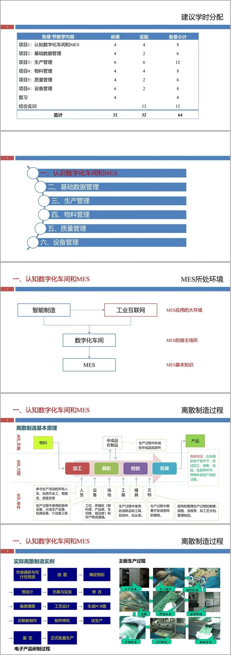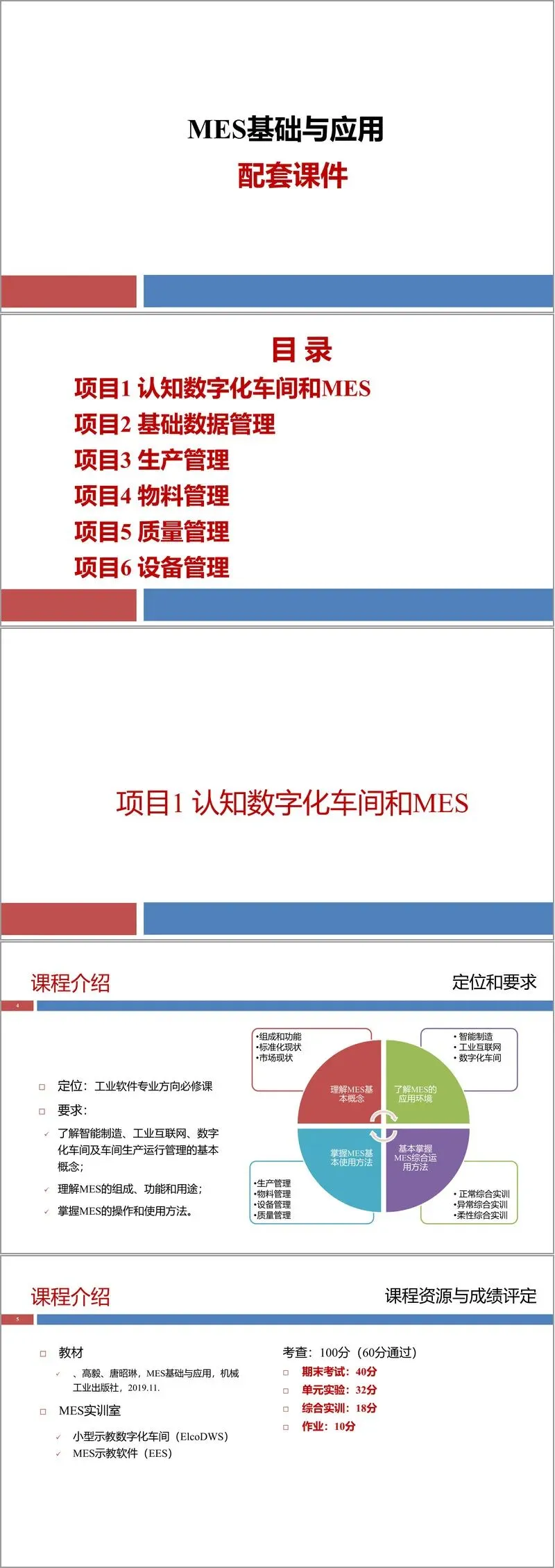 项目一:认知数字化车间和MES该部分首先明确了课程的定位与要求,指出MES是工业软件领域的必修内容,旨在让学员理解智能制造、工业互联网、数字化车间等基本概念,掌握MES的组成、功能与操作方法。教材以《MES基础与应用》为主,配套小型示教数字化车间(ElcoDWS)和MES示教软件(EES)进行实践。课程考核方式综合,包含期末考试、单元实验、综合实训与作业。