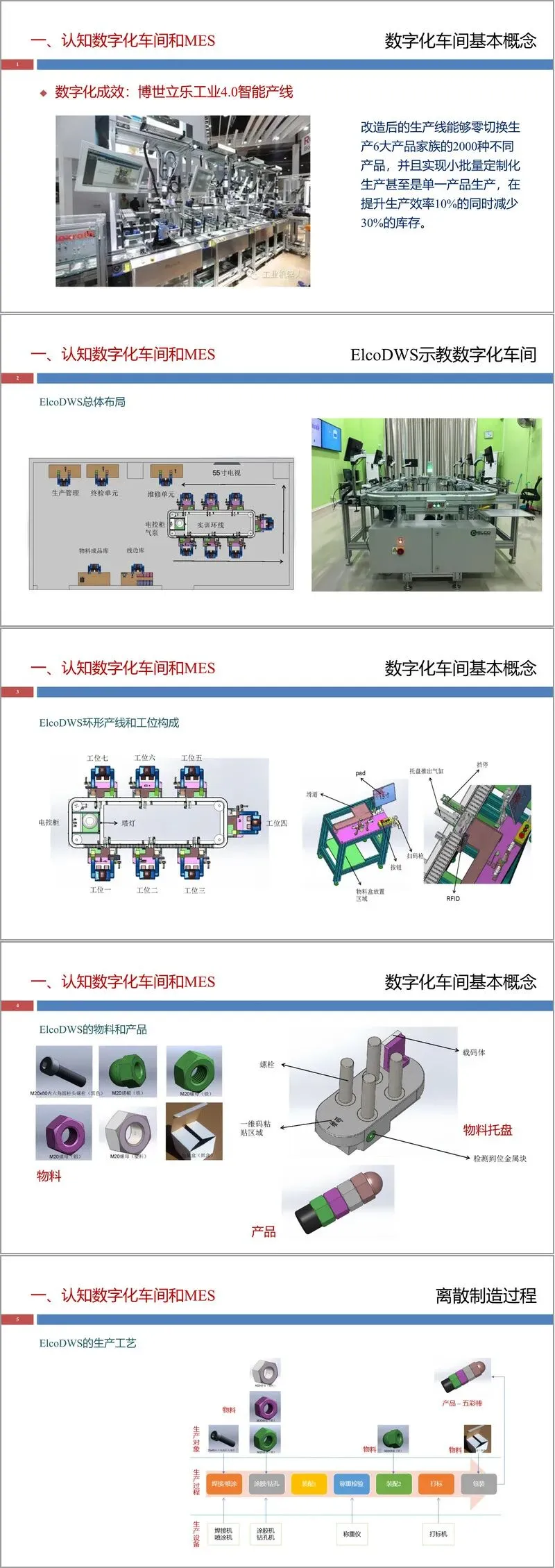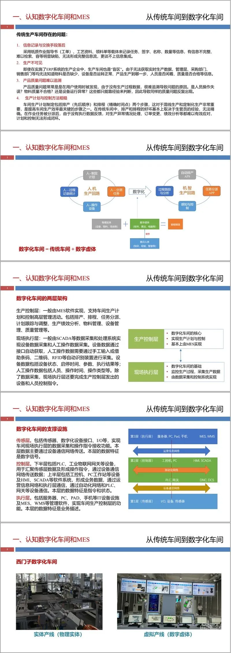 随后,文章深入剖析了从传统车间到数字化车间的演进。传统车间普遍存在信息记录手段落后、生产状态不透明、质量问题难追溯、计划控制粗糙等问题。而数字化车间则通过引入“数字虚体”,构建起由生产控制层(通常由MES实现)和现场执行层(由SCADA等系统实现)组成的两层架构。支撑这一架构的还有传感层、控制层和执行层组成的设施体系。文件以西门子数字化车间和博世立乐工业4.0产线为例,展示了数字化改造在实现柔性生产、提升效率、降低库存方面的显著成效,并以ElcoDWS示教系统具体说明了数字化车间的布局、产线构成、物料与工艺流程。