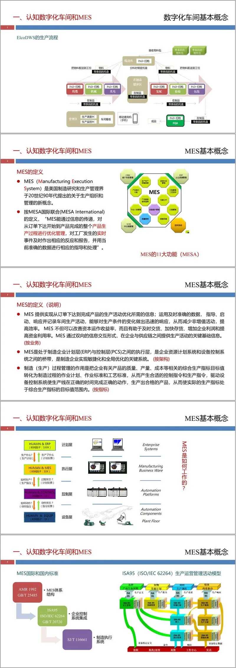 核心概念MES被定义为优化从订单下达到产品完成全过程的生产管理系统,它能对实时事件做出反应,是连接企业计划层(ERP)与控制层(PCS)的桥梁。文件依据MESA标准阐述了MES的11大功能,并通过ISA95模型说明了其在生产运营中的角色。最后,拓展部分介绍了中国智能制造的发展目标、架构以及工业互联网与MES的关系。