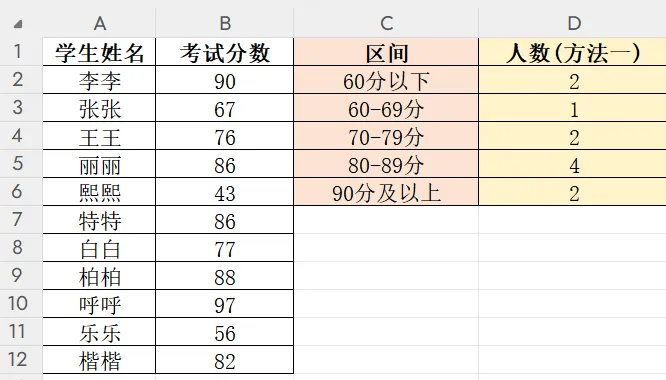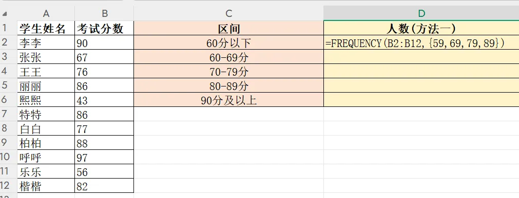 操作步骤:D2单元格输入:==FREQUENCY(B2:B12,{59,69,79,89}),点击回车。