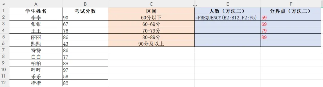 其中,F2:F5表示分段点所在的单元格范围。在E2输入公式=FREQUENCY(B2:B12,F2:F5)后,按Enter键即可得到各个区间的频率分布。