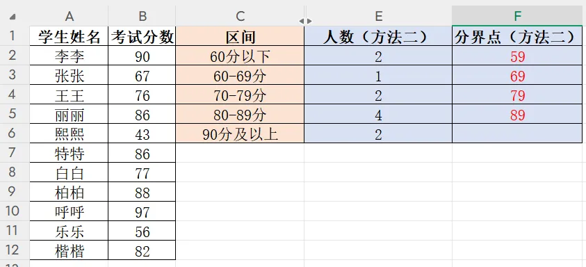 还有一种比较简单的操作方法可以尝试,把分段点写到单独的单元格(如F2:F5),如图所示。