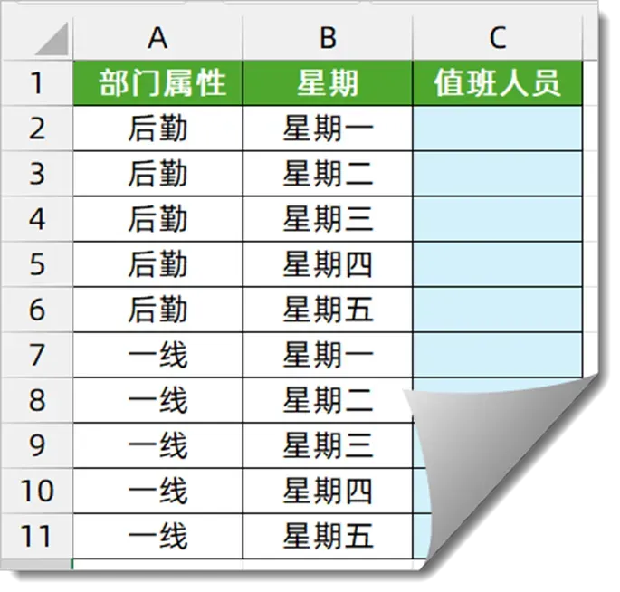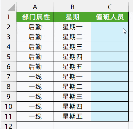 小伙伴们好啊,今天咱们说说如何来避免录入重复数据。如下图所示,希望在C列输入值班人员姓名,这些姓名不能有重复。操作难度:▲▲