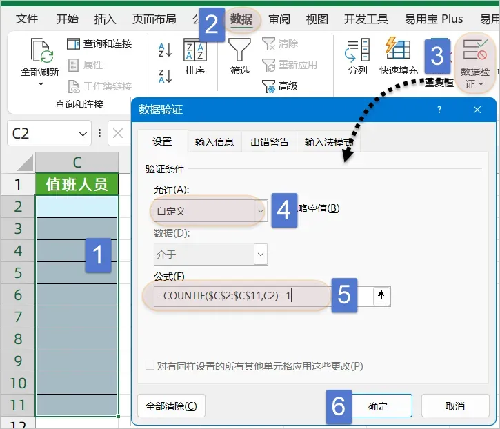 限制条件为=1,也就是仅允许C2在这个区域中出现1次。当数据验证的公式的结果为逻辑值TRUE时,Excel允许录入,否则拒绝输入。