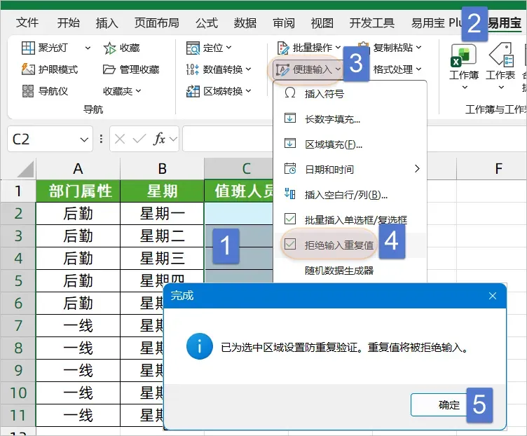 选中需要输入姓名的单元格区域,依次单击【易用宝】→【便捷输入】→【拒绝输入重复值】命令: