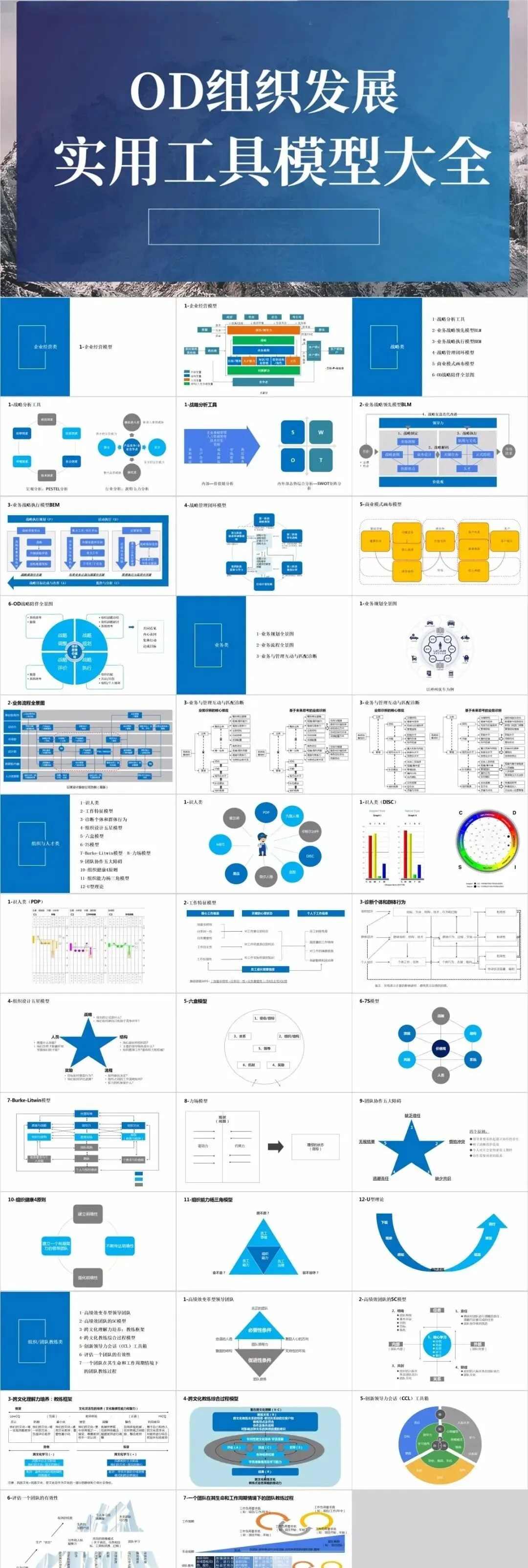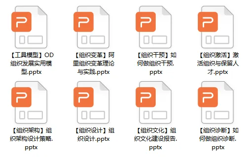 本套资料包合计8套PPT,合计330页,覆盖组织设计、组织诊断、组织变革、组织干预、组织架构、组织激活、组织文化、工具模型8大模块。
