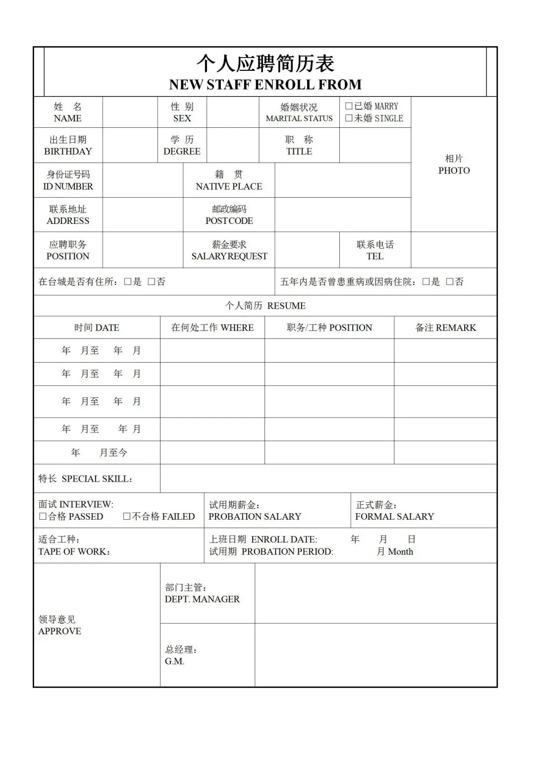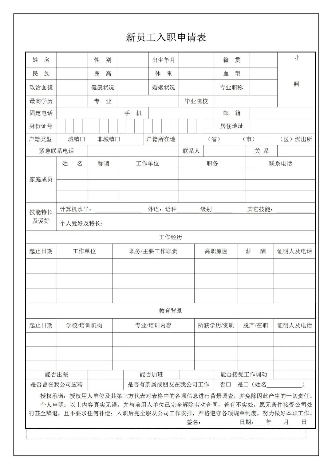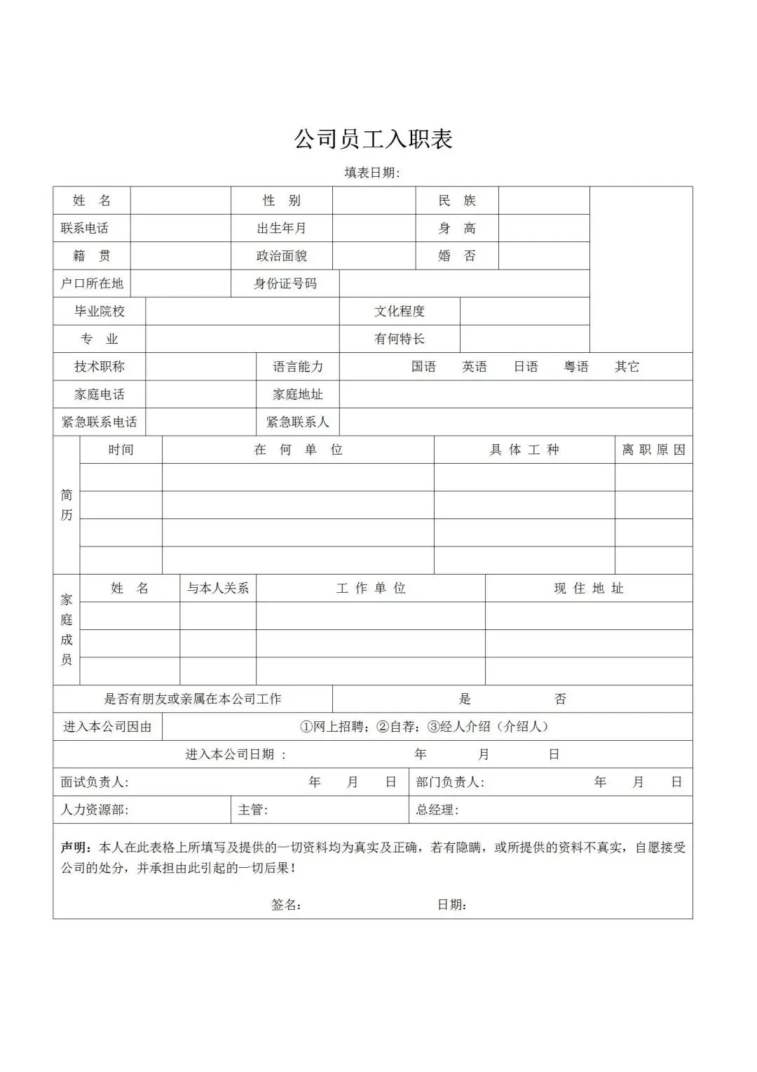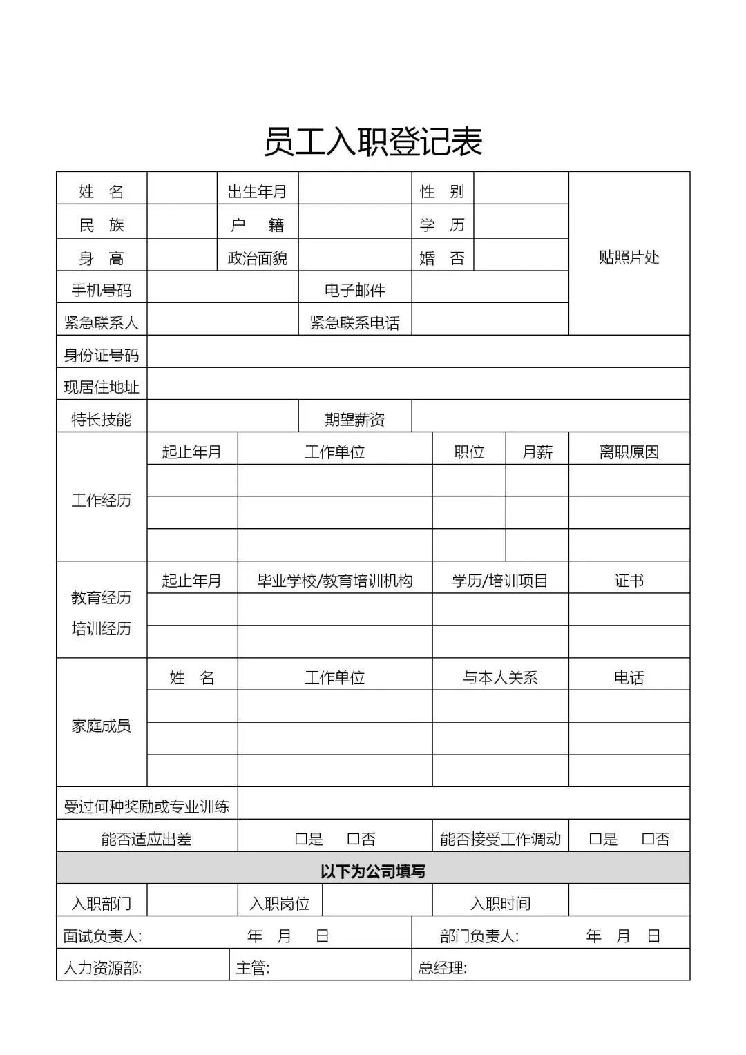 员工应聘入职登记表