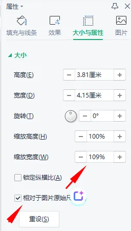 右键图片选择“设置对象格式”,在“大小属性”中适当调整缩放比例(如宽度109%),使公章在PDF中显示正常。