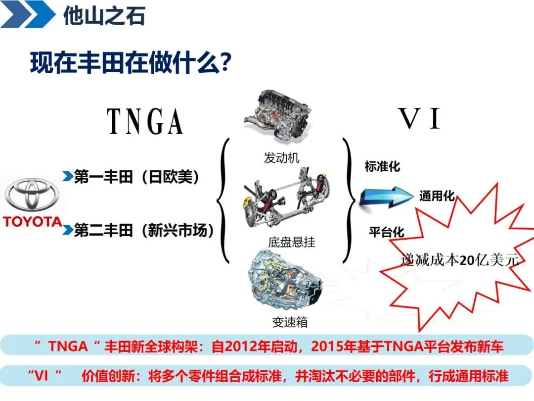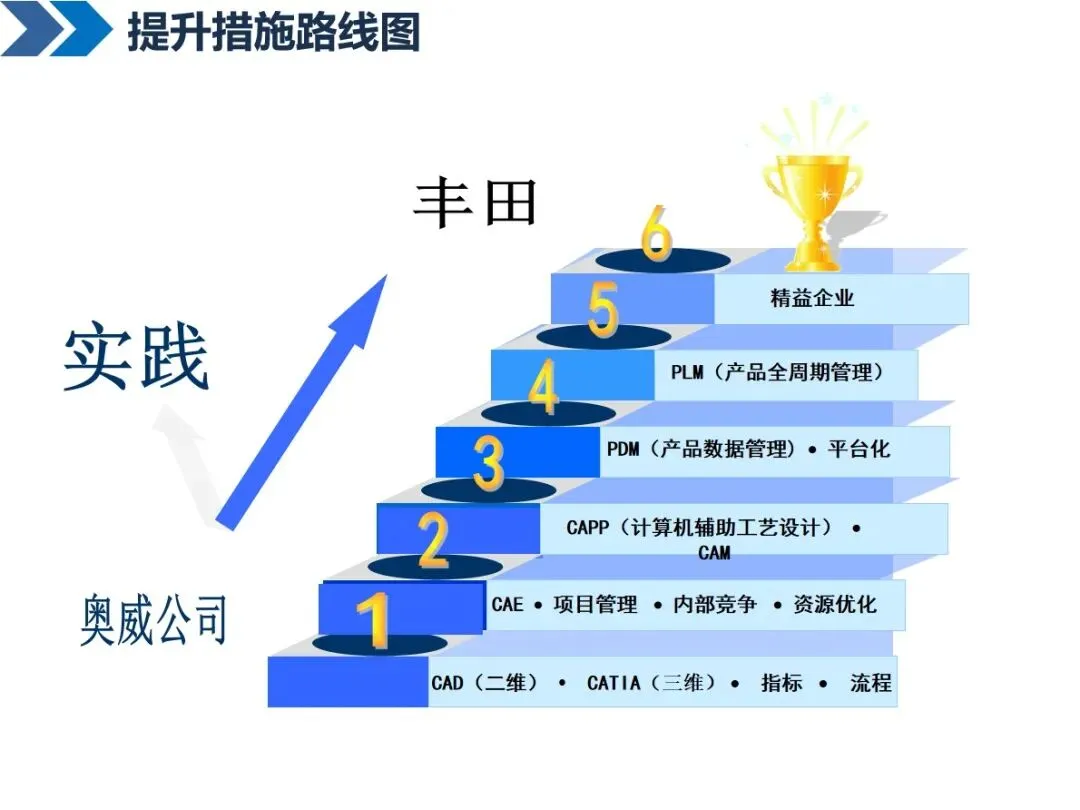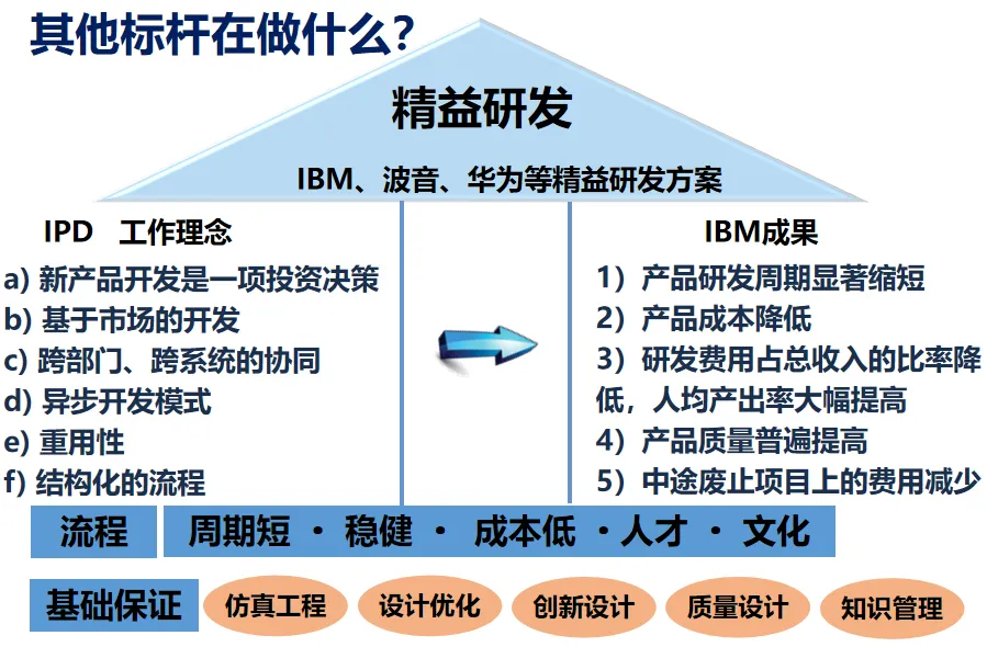 标杆企业在精益研究与开发方面的实践,为精益研究与开发提供了指导。通过 TNGA平台,丰田汽车实现了零部件的标准化和通用性,降低了零部件的冗余度,节约了20多亿元的生产成本;韩国的德尔福公司充分利用 CAD/CAE技术,利用 UG和 CATIA软件建立模型,利用 ANSYS和LS-DYNA软件进行结构分析、疲劳分析和流体分析,完成了从设计到验证的全过程模拟。IBM和华为利用 IPD的思想,实施跨部门合作、流程结构化和复用设计,大大缩短了研发周期,降低了研发成本。