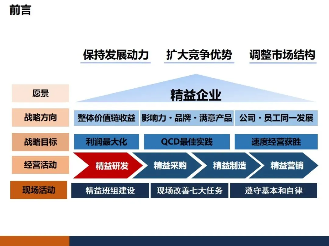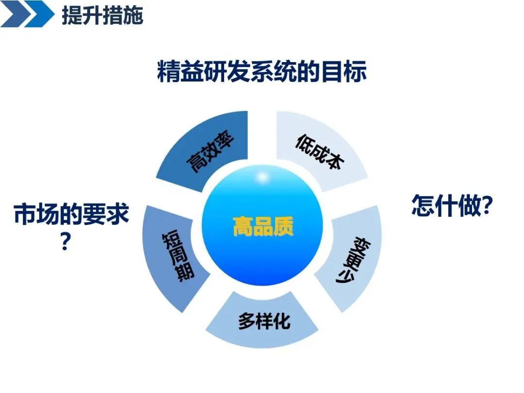 精益研发的最终目标是以利润最大化,QCD最佳化,快节奏的运作来达成企业的战略目标,以高效率,低成本,短时间,高质量的研发成果来协助企业进行市场结构调整,提升竞争优势,达到企业和员工共同成长的目的。
