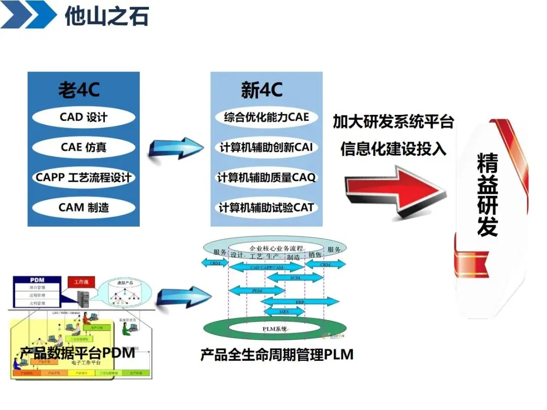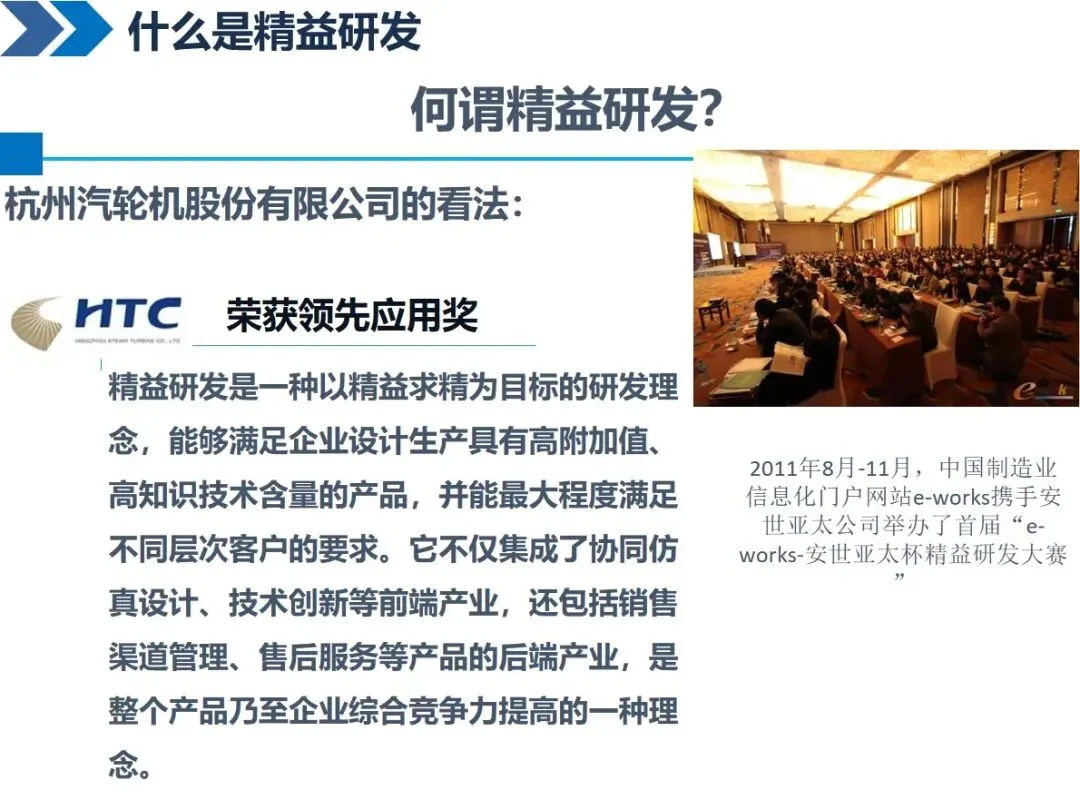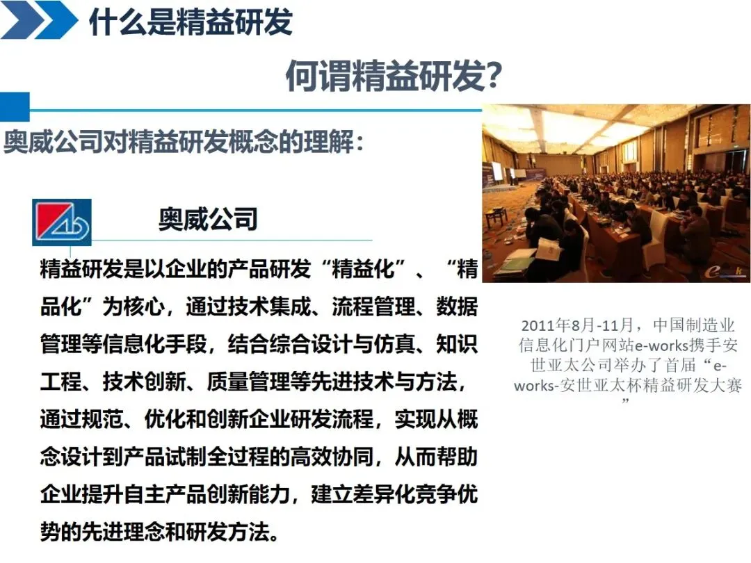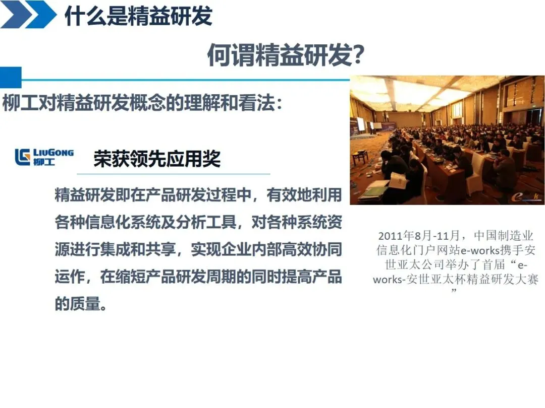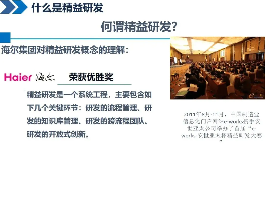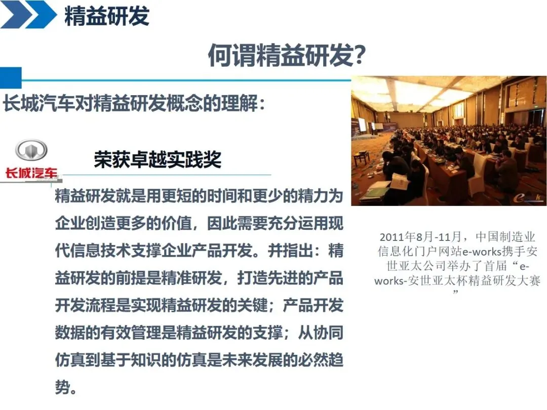 精益研发的核心是以较少的精力、较短的时间创造较大的价值,它需要在精准研发的基础上,通过先进的产品开发过程、有效的数据管理以及现代信息技术的支持来优化整个研发过程。不同的企业都有一个共同的认识:对于长城来说,它可以支持高附加值和高科技含量的产品的研发,并且可以覆盖整个产业链的前端和后端;海尔强调通过技术整合和过程优化来建立差异化优势,其核心是“精益化”和“精品化”;柳工认为它是一项系统工程,包括过程管理和知识库管理。