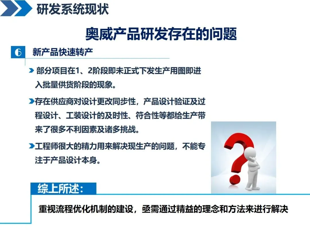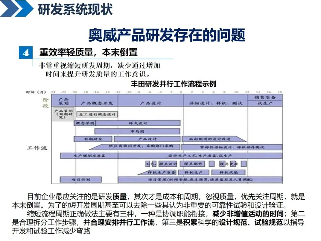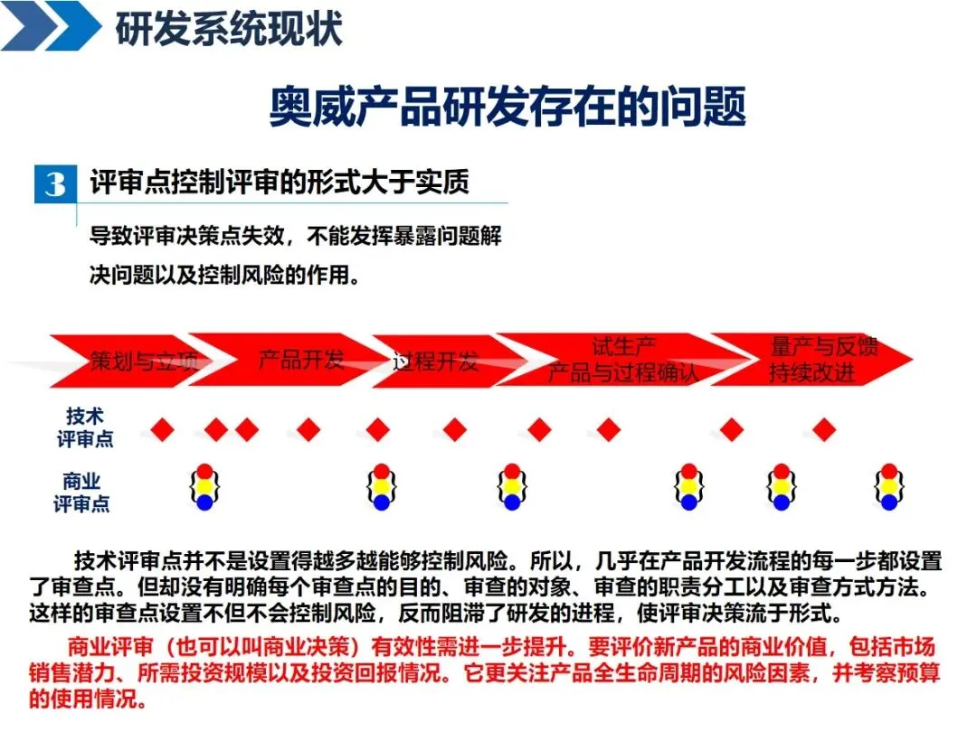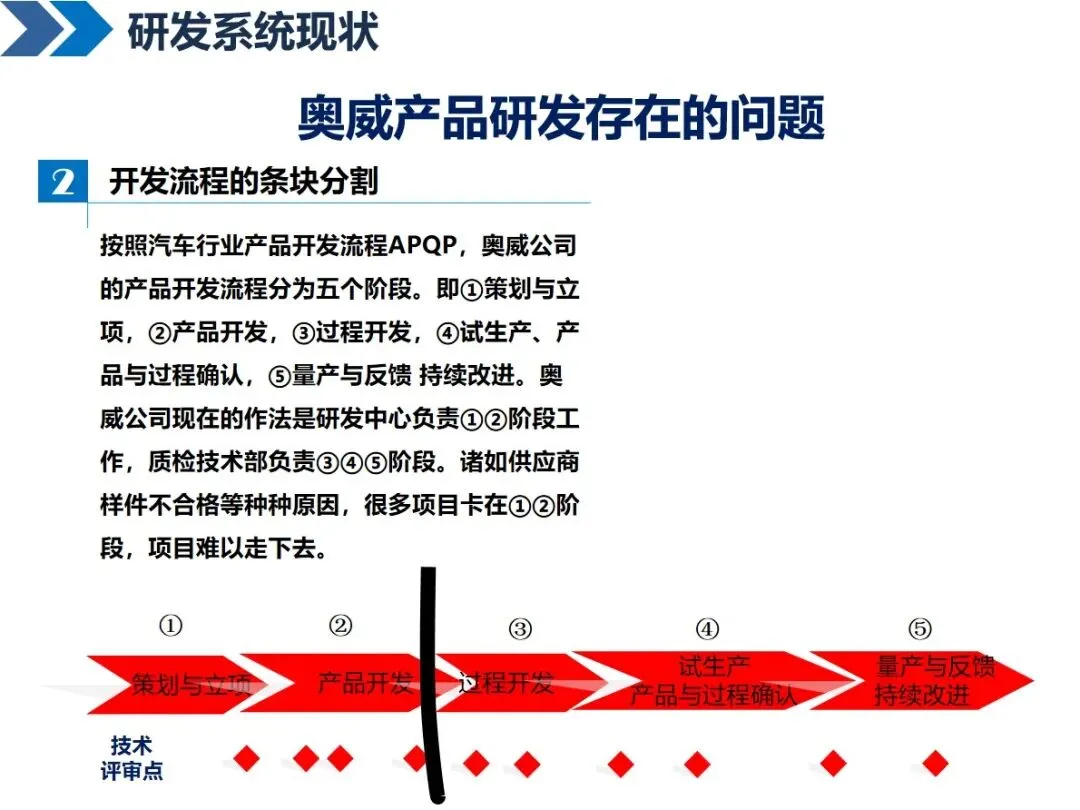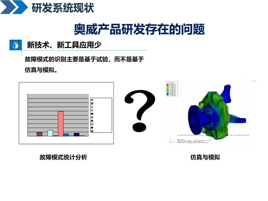 传统的研发模式存在很多“痛点”,比如奥威面临着项目管理人员之间的部门间协调问题,10个项目管理人员要与153个项目进行对接;研发流程分块,按照 APQP流程分解之后,各部门之间的衔接出现问题,造成项目停滞;评价点的设置标准不明确,形式多于内容;重周期、轻质量、甚至忽略必要的验证,新技术和新工具的应用不够充分,对故障的识别更多地依靠实验,而不是模拟仿真。