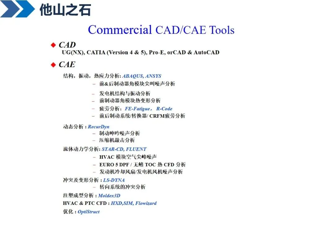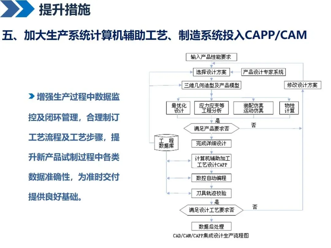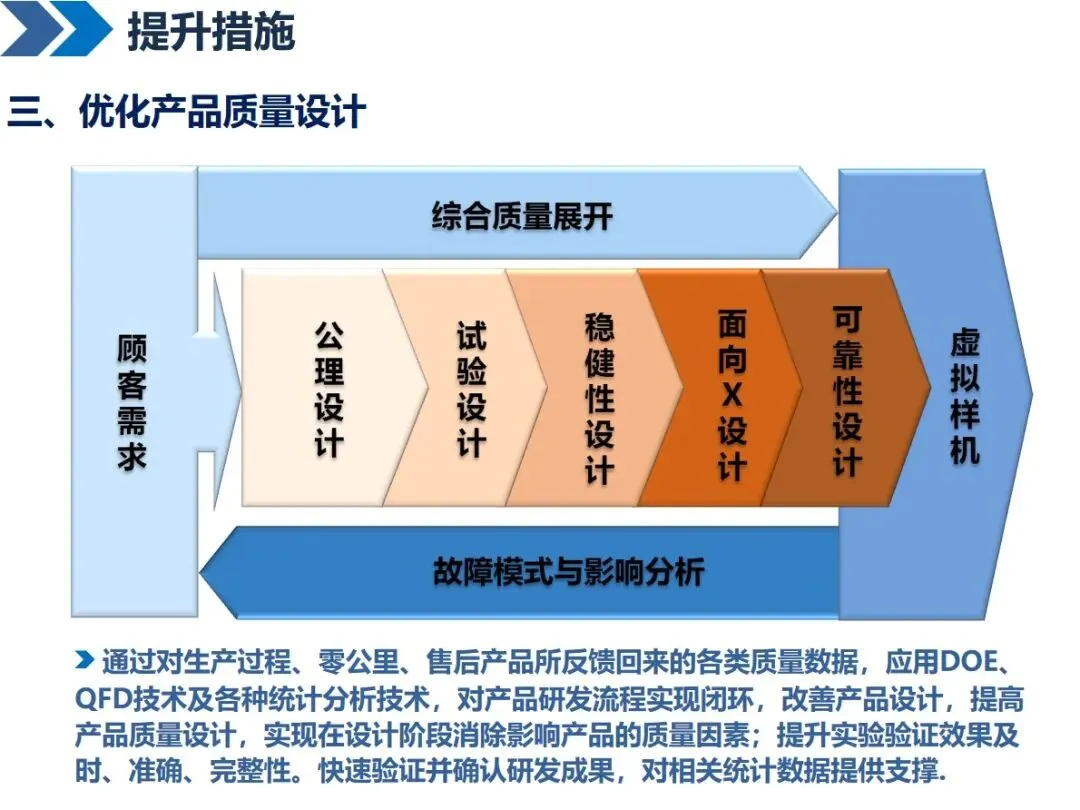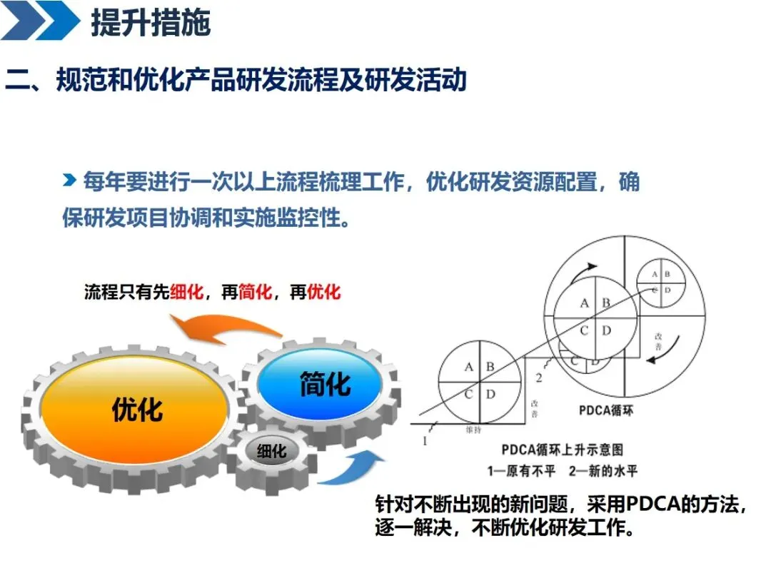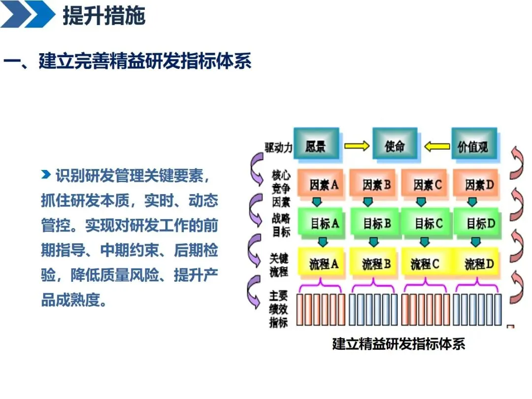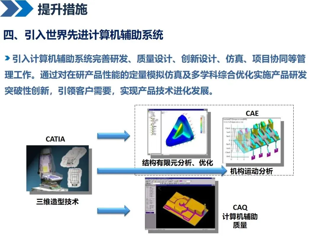 实施精益研发需多维度努力:建立精准的研发指标,动态监控整个流程;按照PDCA循环对研发流程进行优化,通过打破部门之间的界限,对研发流程进行细化和简化;将失效模式分析与可靠性设计相结合,在产品设计阶段就将潜在的质量问题扼杀在摇篮中;引进先进的计算机辅助设计软件 CATIA和CAE,加强仿真和仿真技术的应用;通过产品数据管理和产品生命周期管理系统,将产品开发过程中的数据集成在一起,达到资源共享的目的;同时,优化企业内部运行机制,强化标准化基础平台建设和完善试产车间。