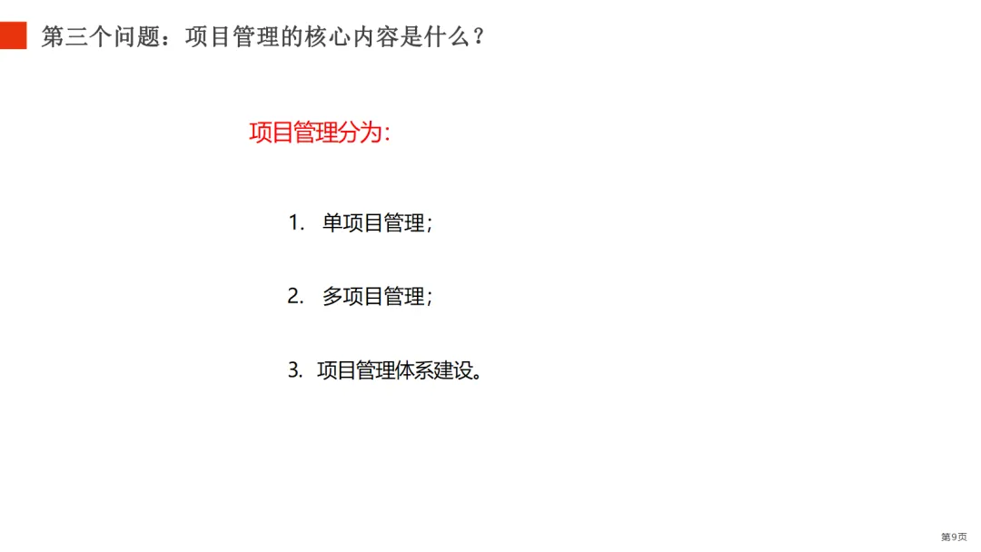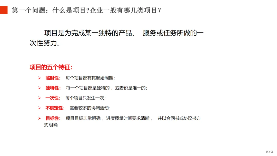 全要素项目管理重新定义了项目和项目管理的概念,并阐述了项目的五个特征,包括临时性、独特性、一次性、不确定性和目标性。接着,文章介绍了企业中的几类项目,包括产品开发项目、定制开发项目、预研项目和平台项目。