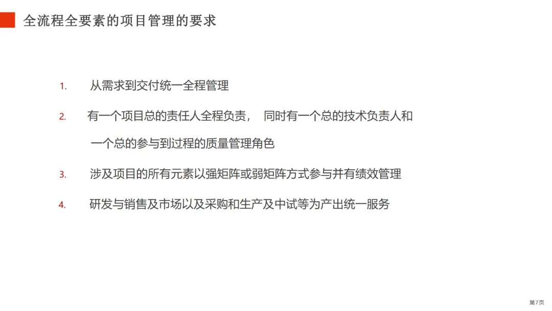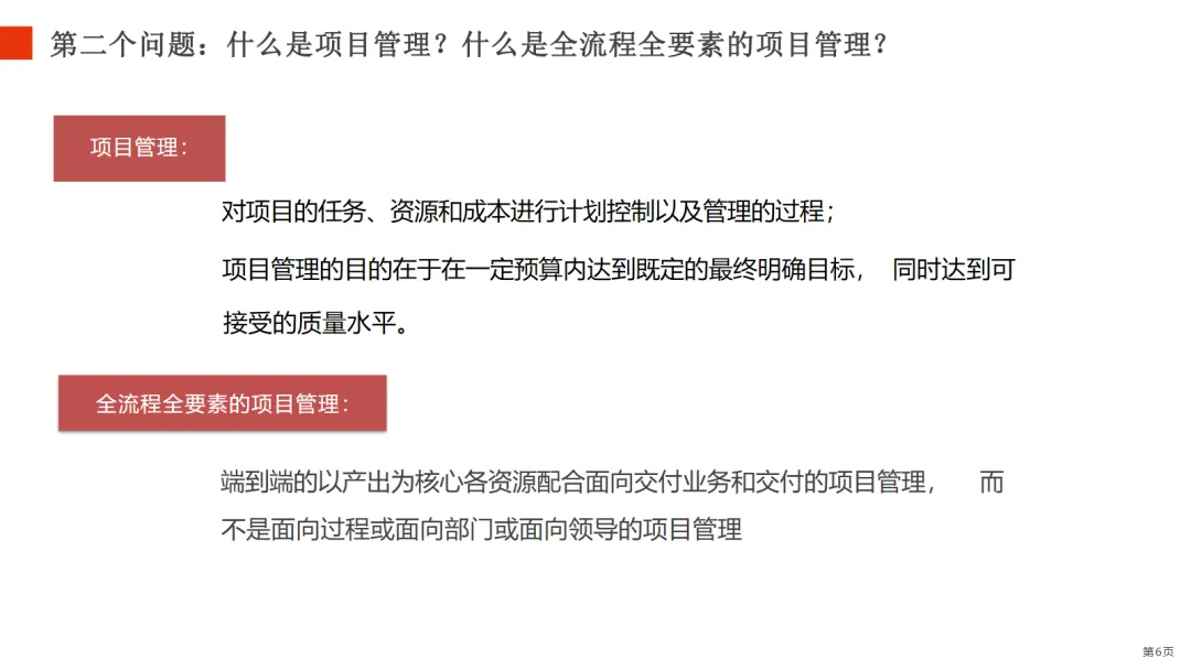 而全流程全要素的项目管理则是端到端的以产出为核心,各资源配合面向交付业务和交付的项目管理,强调从需求到交付的统一全程管理,并涉及项目的所有元素。