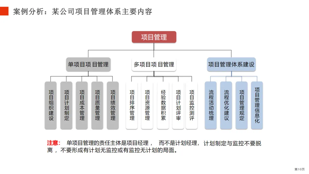 此外,实践指南还提到了全流程全要素的项目管理的要求,包括从需求到交付的统一全程管理、有一个项目总的责任人全程负责等。同时,文章还通过案例分析,展示了某公司项目管理体系的主要内容,包括单项目管理和多项目管理的责任主体、项目管理体系建设、计划监控与测评等。