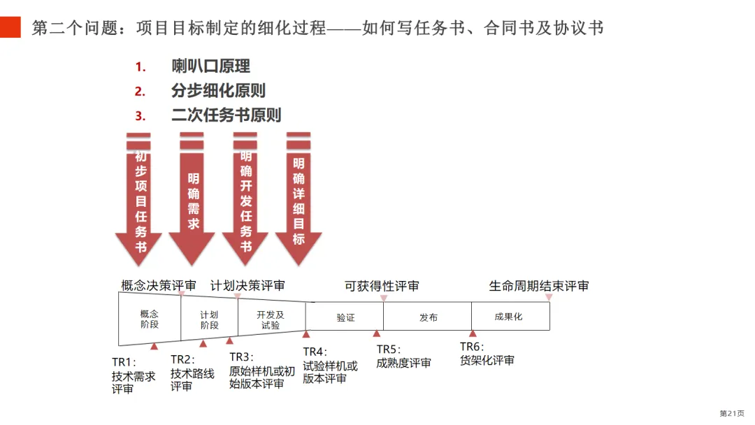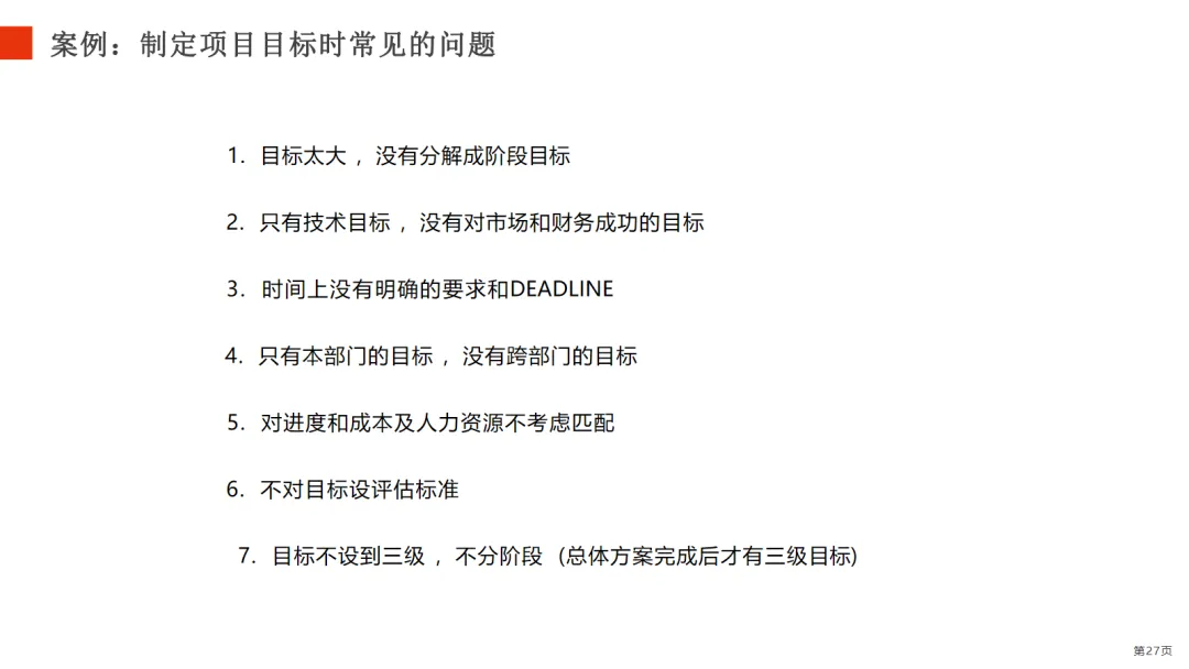 - 项目目标内容:包括客户交付目标、内部成果共享目标(如重用CBB)、财务成功目标(收入、成本控制、回款)、人员培养目标和共享目标,目标制定要遵循喇叭口原理、分步细化原则和二次任务书原则,明确任务书、合同书及协议书内容。