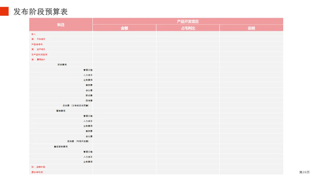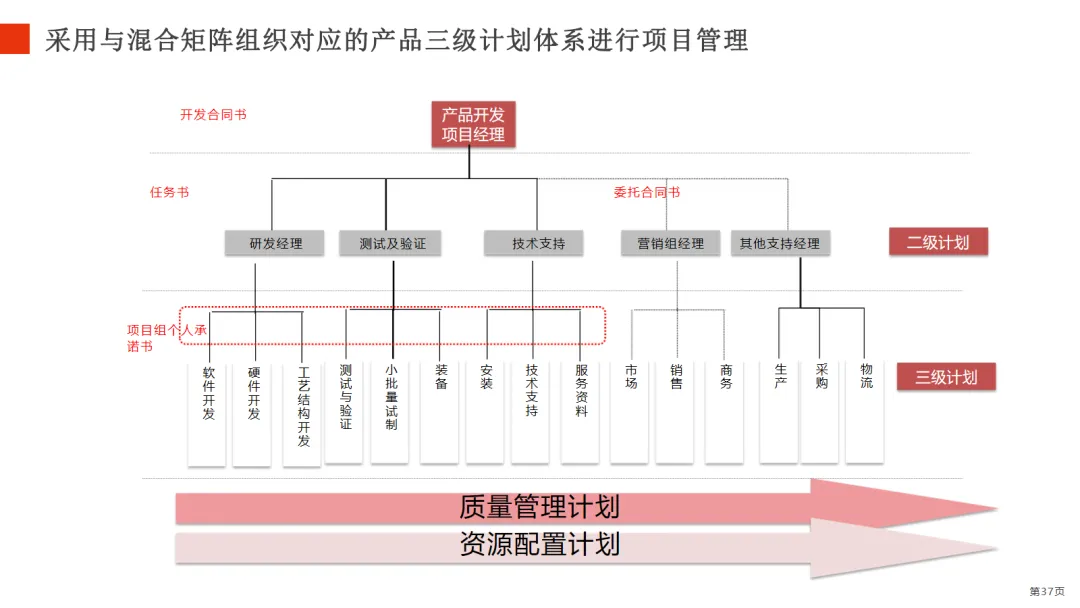 - 计划分类与责任主体:一级计划由项目总负责人制定,公司审批,包括关键路径的二级计划及三级计划;二级计划由PDT核心成员制定,需与职能部门经理沟通协商,包括软件、硬件、营销等多类;三级计划由项目组成员制定,需考虑二级计划约束和资源配合,模块经理确定项目组工作计划目标并与骨干成员讨论制定。