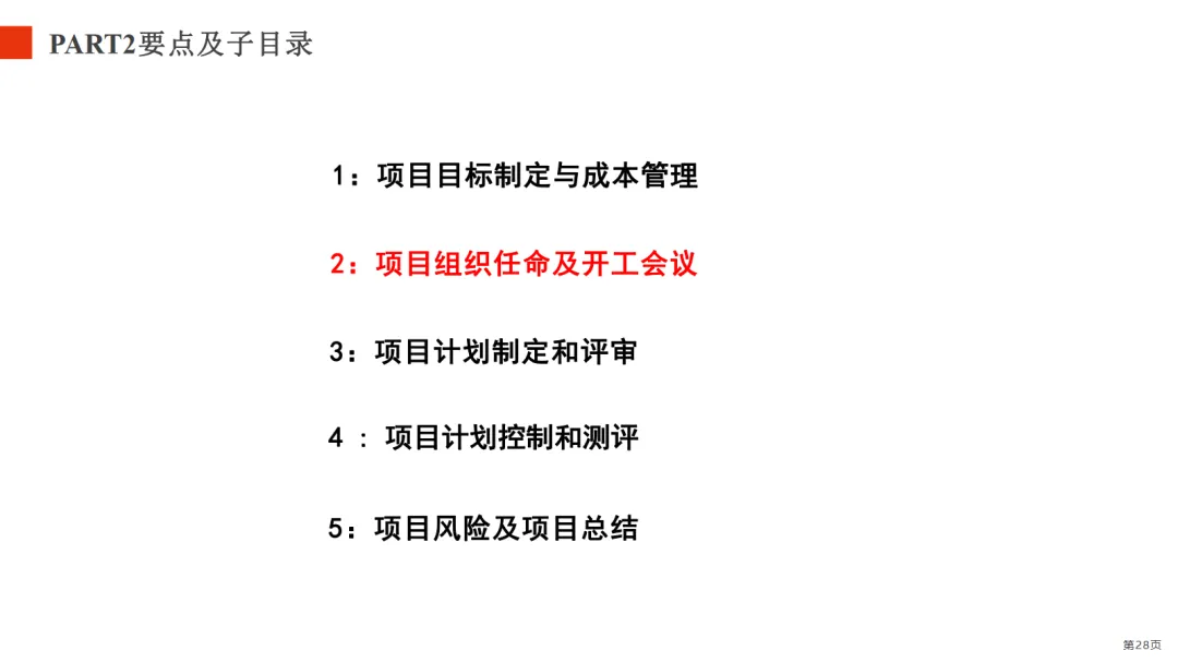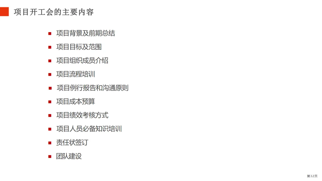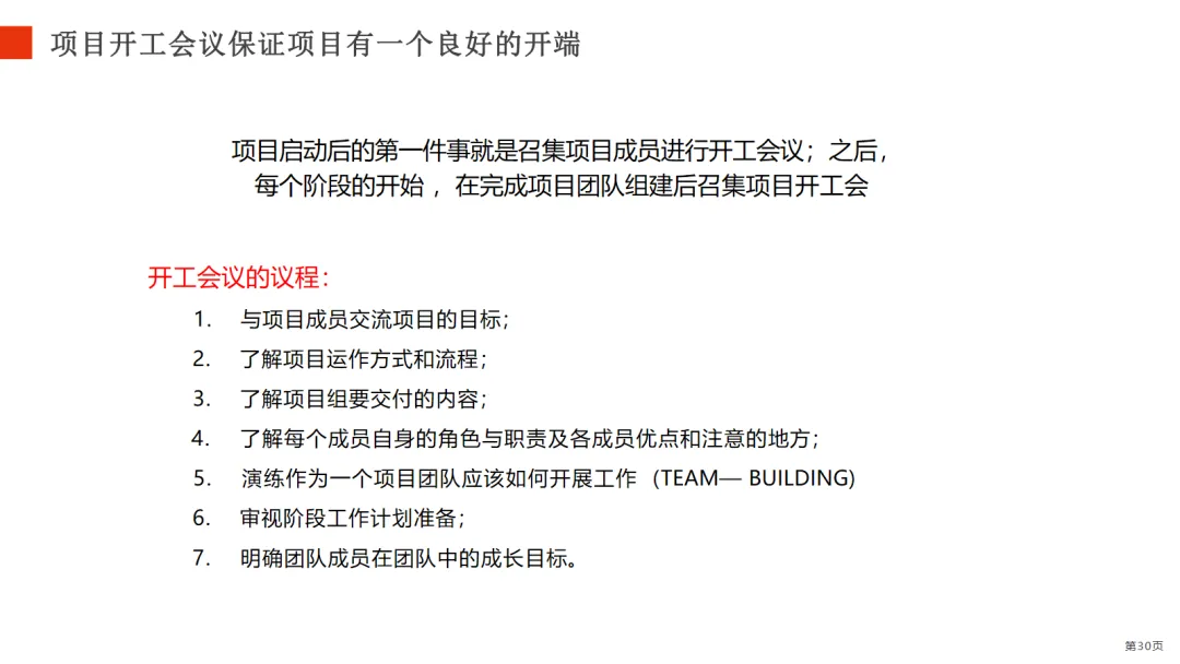 -开工会议:在项目启动及各阶段开始时召开,议程包括交流项目目标、了解运作方式流程、交付内容、成员角色职责、团队演练、审视计划、明确成长目标等,保证项目良好开端和阶段承接继承。