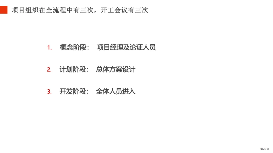 - 项目组织:项目全流程中有三次组织任命,不同阶段人员参与不同,如概念阶段有项目经理及论证人员,计划阶段有总体方案设计人员,开发阶段全体人员进入。