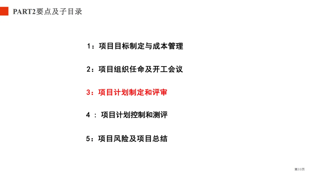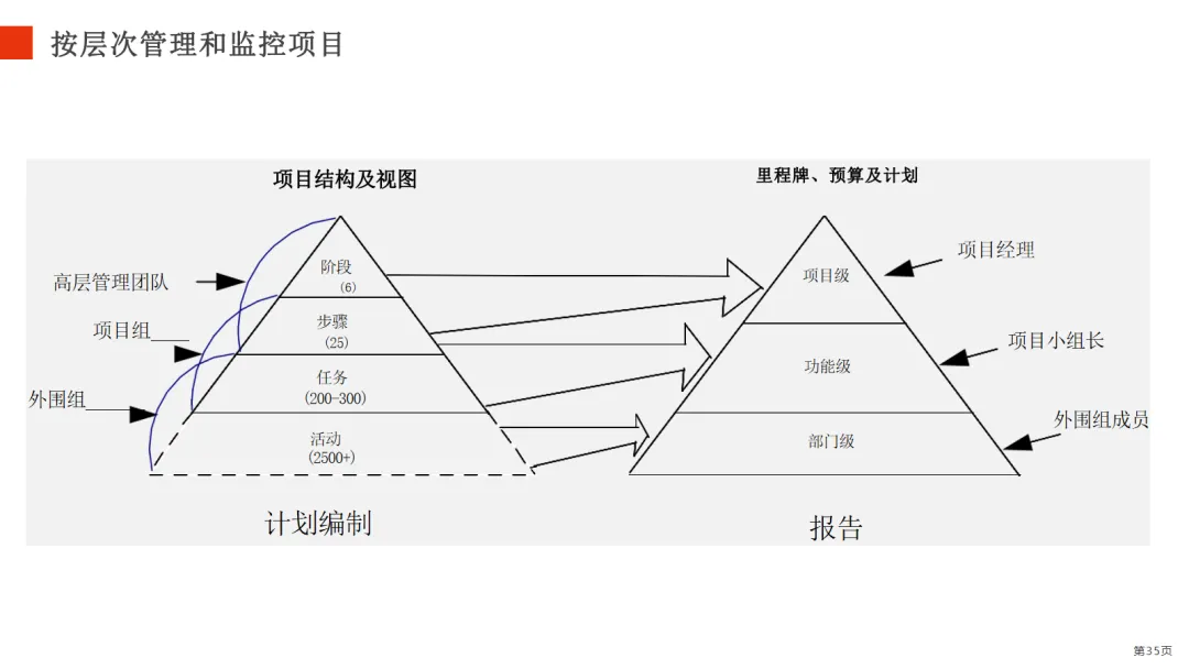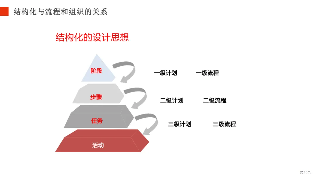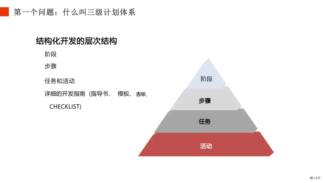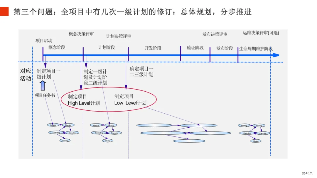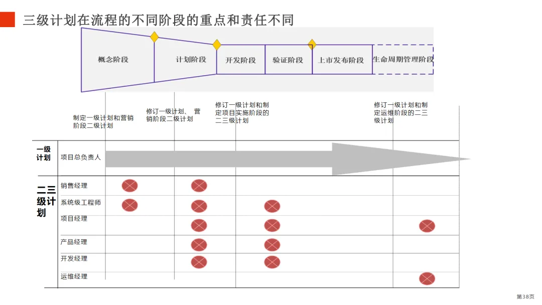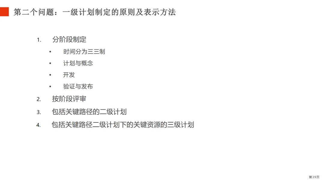 - 计划制定原则与方法:一级计划分阶段制定(时间三三制),按阶段评审,包含关键路径二级计划及关键资源三级计划;二级计划根据一级计划确定总目标,与相关方协商确定工时、资源和时间,根据三级计划修正;三级计划由模块经理根据二级计划确定目标,与骨干成员讨论制定,需考虑二级计划约束和资源配合。