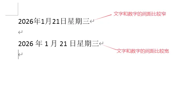 先来看一下两行相同的内容,但中文与数字的间距不同,如下图1-1所示;