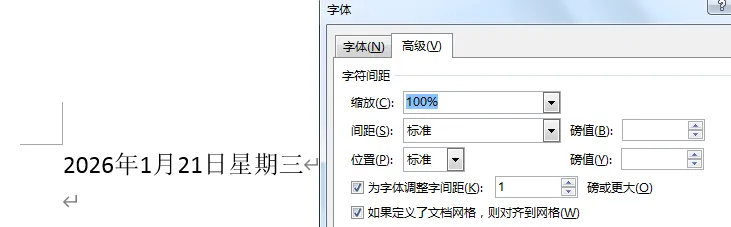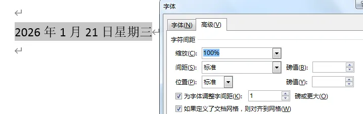 这里可以先看一下字符间距,打开字体的对话框后,在高级处可以看到两者的字符间距是一样的,如下图1-2、1-3所示