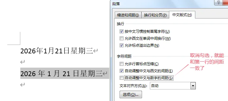 选择第二行,鼠标右键点击段落,打开段落对话框,在中文版式选项卡下方取消勾选“自动调整中文与数字的间距”,就能将间距缩小成与第一行一致,如下图1-4所示