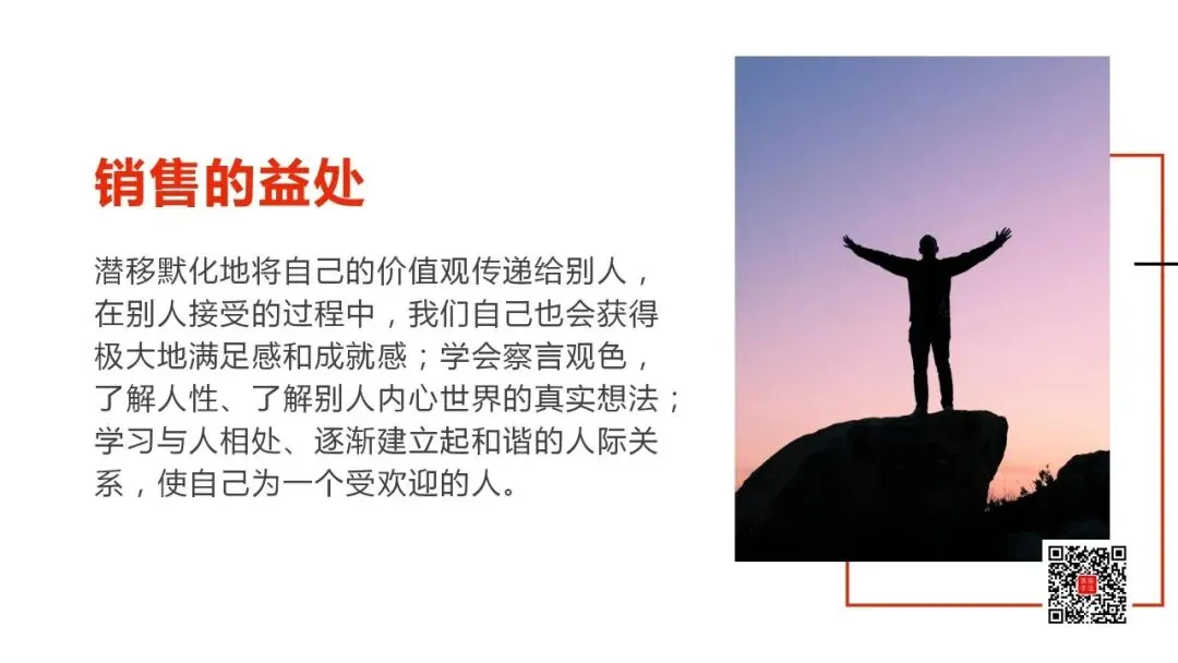 潜移默化地将自己的价值观传递给别人,在别人接受的过程中,我们自己也会获得极大地满足感和成就感;学会察言观色,了解人性、了解别人内心世界的真实想法;学习与人相处、逐渐建立起和谐的人际关系,使自己为一个受欢迎的人。