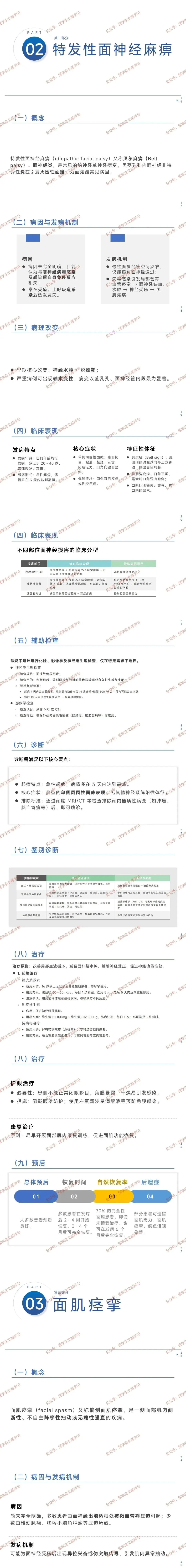 - 预后:多数 2-4 周开始恢复,3-4 个月痊愈,70% 完全性面瘫患者 6 个月内可恢复,部分遗留面肌痉挛等后遗症。