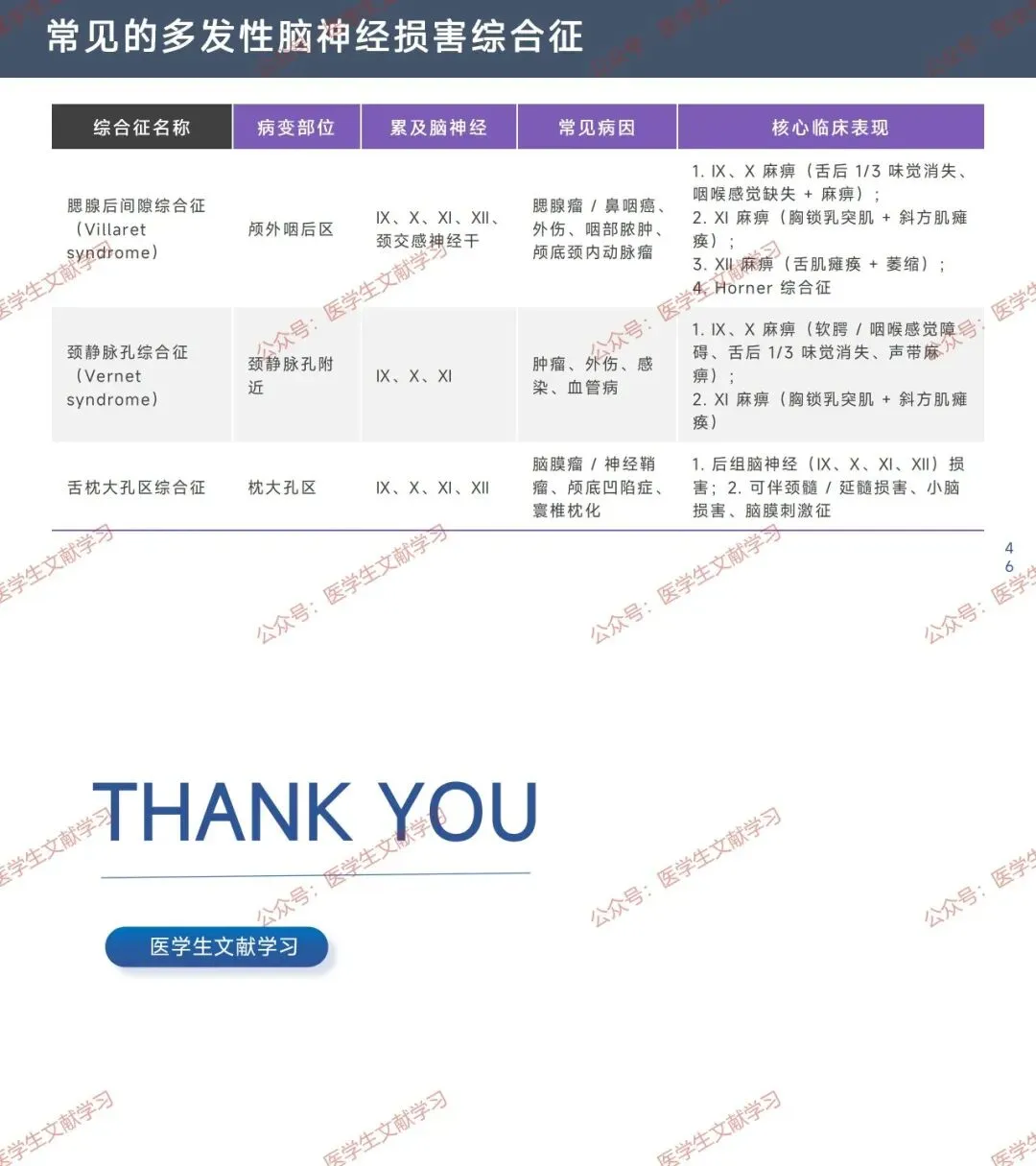 - 核心表现:多个脑神经支配区功能障碍(如眼球运动障碍、面部感觉异常),特定颅底区域病变形成综合征(如海绵窦综合征、眶上裂综合征)。