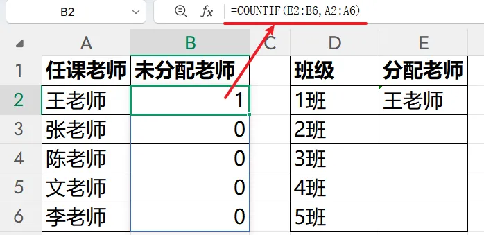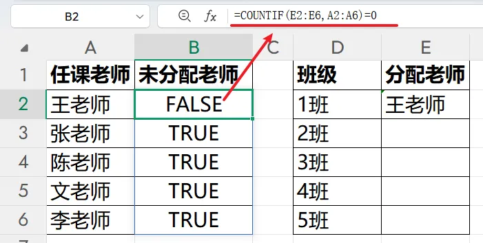 =FILTER( A2:A6, COUNTIF(E2:E6, A2:A6) = 0)COUNTIF(E2:E6, A2:A6)含义是:➡ 统计 A 列中每一位老师,在 E 列已分配区域 出现了多少次。