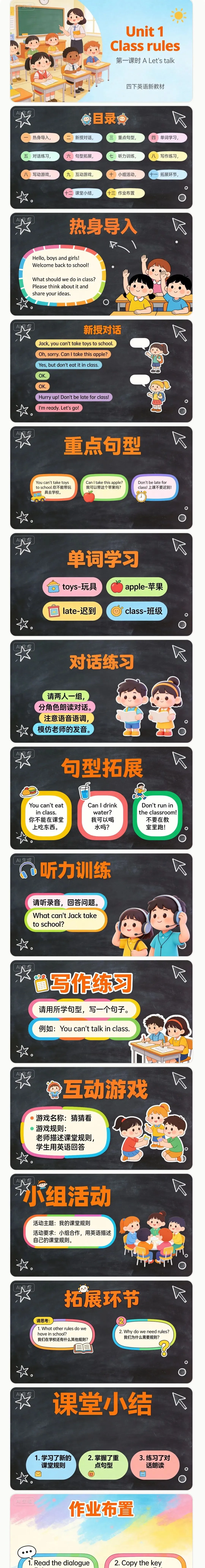 课件结构与内容要点1. **封面页** - 标题:Unit 1 Class rules - 副标题:第一课时 A Let's talk - 视觉元素:卡通教室背景,师生互动插画2. **目录页** - 包含18个核心模块:Warm-up, New Words, Let's Talk, Key Sentences, Practice, Game Time, Expansion, Summary, Homework, Feedback, 看动画选择, 听内容排序, 跟读模仿, 拓展知识, 对话练习, 句型拓展, 听力训练, 写作练习, 互动游戏, 小组活动, 拓展环节, 课堂小结, 作业布置, 反馈页 - 设计:图标+文字横向排列,彩色分类标签3. **Warm-up环节(2页)** - 互动问题:"What rules do we have in class?" - 图片匹配游戏:展示6张课堂场景图(举手、安静听讲等),学生选择正确行为 - 英文指令:"Point to the picture of 'Listen carefully'."4. **New Words环节(3页)** - 核心词汇:rule, listen, quiet, speak, line up, hands up - 设计:单词卡片+卡通动作插图,音标标注 - 互动:"Act like 'line up' and say the word!"5. **Let's Talk对话呈现(4页)** - 对话原文: - Teacher: "Class, we have new rules. Let's read them." - Students: "OK!" - Teacher: "Rule 1: Listen carefully." - Students: "Listen carefully." - 设计:分角色对话气泡,卡通人物表情生动 - 互动:角色扮演(Pair work: Student A as teacher, Student B as student)6. **Key Sentences句型训练(3页)** - 重点句型: - "We should..." - "Don't..." - "Please..." - 例句:"We should listen to the teacher." "Don't talk in class." - 互动:句型匹配游戏(左侧句型与右侧图片连线)7. **看动画选择** - Please watch the Let's talk animation, and choose whether this animation is about rules or games.8. **听内容排序** - Please listen to the Let's talk content, and sort the pictures.9. **跟读模仿** - Please follow and imitate the Let's talk content, pay attention to the pronunciation and intonation.10. **拓展知识** - Please expand the learned knowledge, and present more small scene pictures of children's activities.11. **对话练习** - Please work in pairs, and read the dialogue in roles. Pay attention to the pronunciation and intonation, and imitate the teacher's pronunciation.12. **句型拓展** - 1. You can't eat in class. You can't eat in class. - 2. Can I drink water? Can I drink water? - 3. Don't run in the classroom! Don't run in the classroom!13. **听力训练** - Please listen to the recording, and answer the question. What can't Jack take to school?14. **写作练习** - Please write a sentence using the learned sentence patterns. For example: You can't talk in class.15. **互动游戏** - Game name: Guess. Game rules: The teacher describes the class rules, and the students answer in English.16. **小组活动** - Activity theme: My class rules. Activity requirements: Work in groups, and describe your own class rules in English.17. **拓展环节** - Please think about: 1. What other rules do we have in school? What other rules do we have in school? 2. Why do we need rules? Why do we need rules?18. **课堂小结** - 1. Learned new class rules. Learned new class rules. 2. Mastered key sentence patterns. Mastered key sentence patterns. 3. Practiced dialogue reading. Practiced dialogue reading.19. **作业布置** - 1. Read the dialogue 5 times. Read the dialogue 5 times. 2. Copy the key sentences 3 times. Copy the key sentences 3 times.20. **反馈页** - How do you feel about today's lesson? Please give us your feedback.