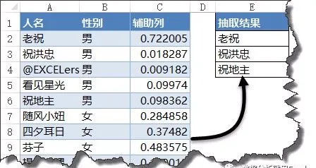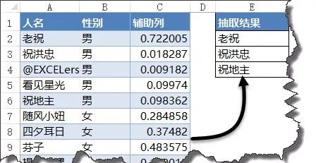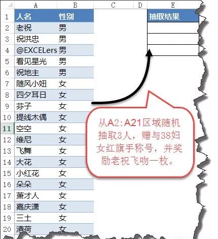 举个栗子,如下图所示,A2:A21是EH培训学院的20名……男女。现在需要从中随机抽取3人,授予38妇女红旗手的称号。