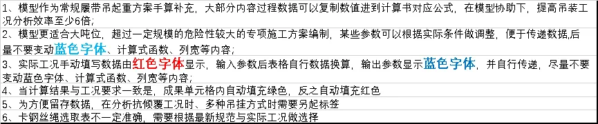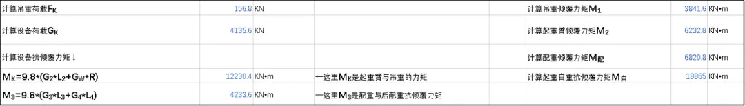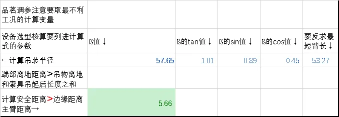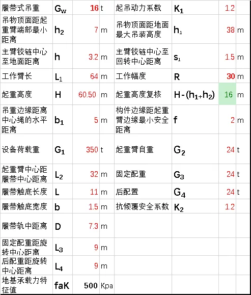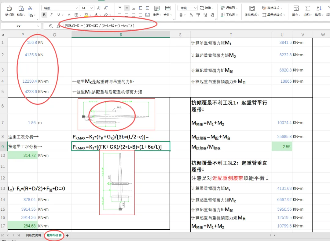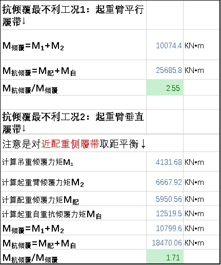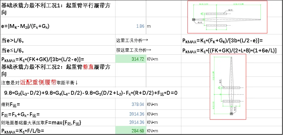 e≤L/6当计算结果满足最不利工况时工作要求时,绿色填充 表格;反之,红色填充表格。4、上述过程对不同的荷载、不同角度做简易的传递计算。通过不同仰角,也可以发现一些数值变化的规律,进而在给的约束条件下,选择改变配重、半径限制、或者加强地锚等措施。因此,在明确主要的参数后自动传递计算结果判断,快速调整工作条件以达到合理选型方案,可以减少大量的重复、计算返工。